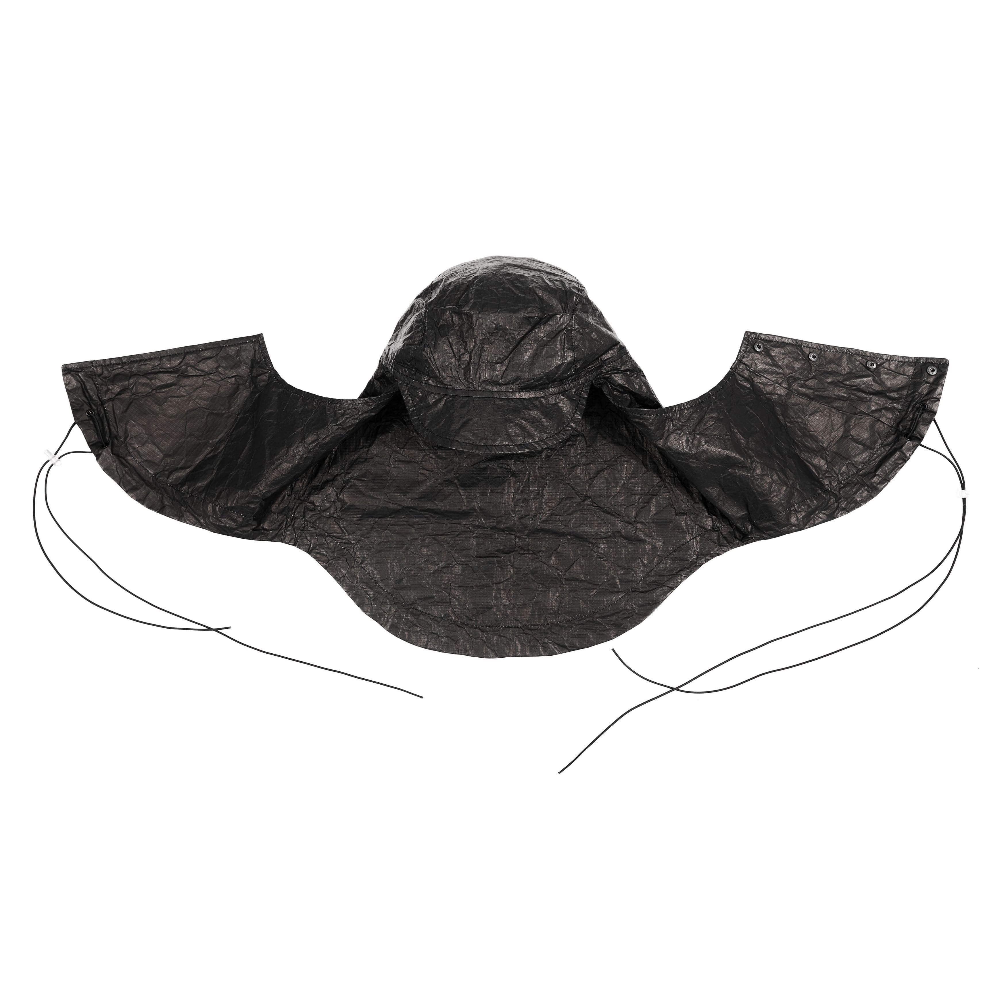 Mütze aus weichem, strukturiertem Tyvek. Je nach Wetter und Stimmung fungiert sie als Kapuze, Hut und Mantel. Schützt vor Wind durch einen geschlossenen Hals- und Kragenbereich. Sitzt fest auf dem Kopf. Durch verdeckte Verstellung mit Metallknöpfen kann die Mütze auch offen getragen werden. Dekorative, verlängerte Kordeln. Schwarzes Akzentlogo im Nacken. Externes Pflege-Etikett mit rotem Faden aufgenäht.