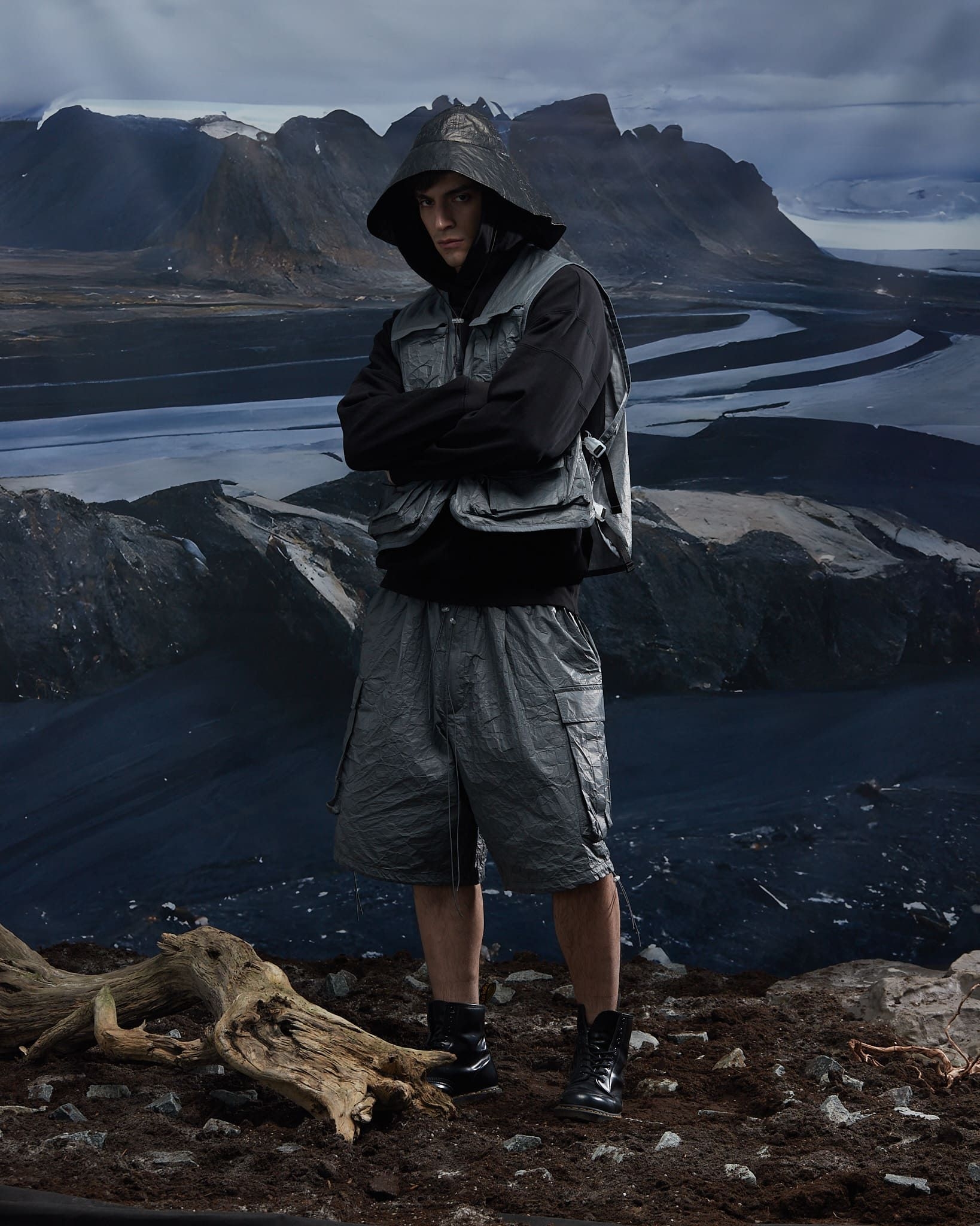 Gilet aus weichem, strukturiertem Tyvek. Lockere Silhouette. Voluminöse Außentaschen an Brust und Taille. Gummierte, wasserdichte Reißverschlüsse. Dekorative Verschlüsse, die Vorder- und Rückseite verbinden. Verlängerte Kordeln. Schwarzes Akzentlogo auf dem Rücken. Externes Pflege-Etikett mit rotem Faden aufgenäht.