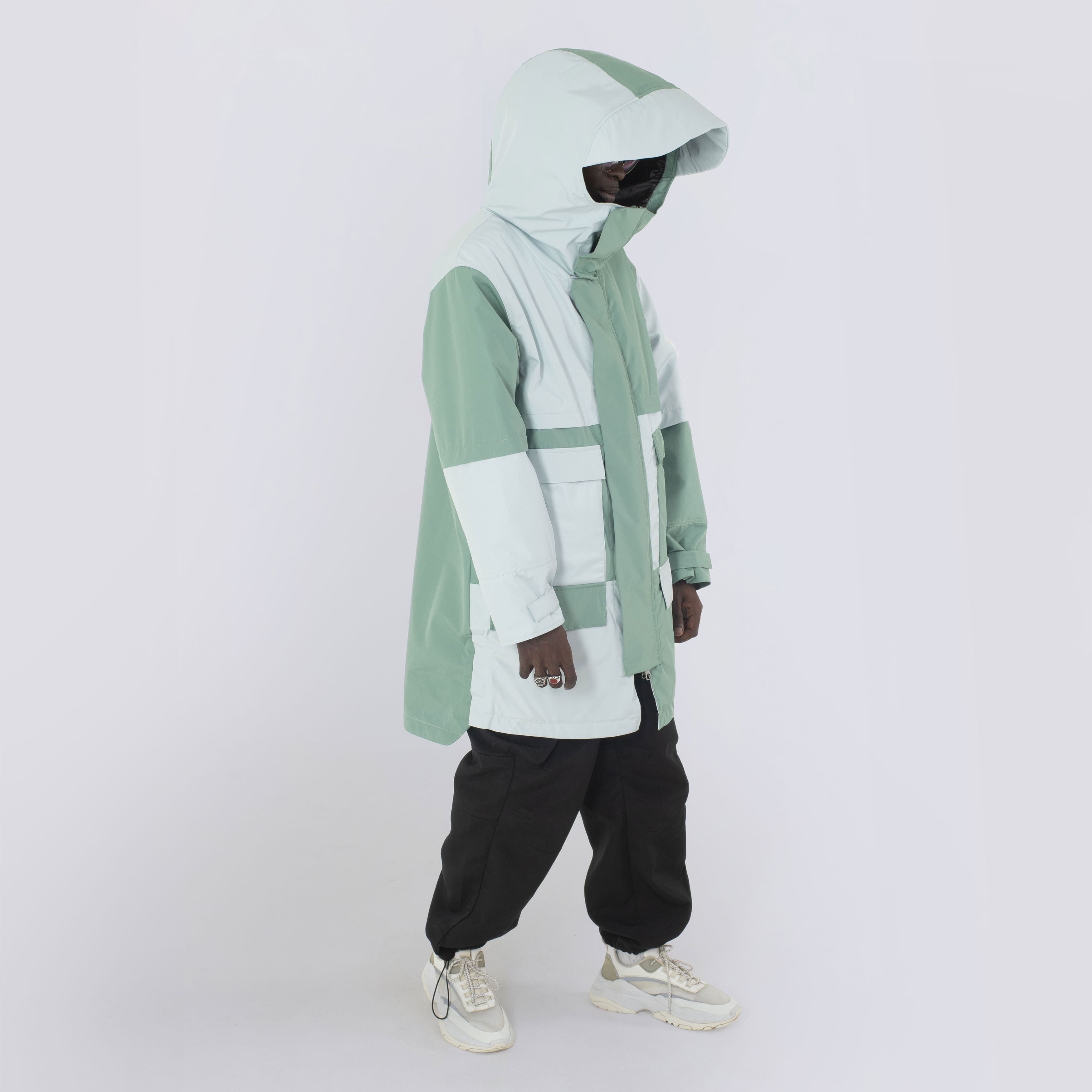 Parka in zwei Farben: strenges Schwarz und Smaragd. Jacke aus Hightech-Tornado-Gewebe mit 10.000/10.000-Tornado-Membran. Temperaturbereich bis -20°C. Hoher Schutz vor Regen und Wind. Breite Silhouette und lange Basis. Flache große Taschen mit versteckten Magneten und starkem Marken-Metallreißverschluss. Eine vergrößerte voluminöse Kapuze mit Visier, die den Kopf wie ein Mantel vollständig verdecken kann - eine Anspielung auf den Raumanzug. Versteckte Tasche mit GPS-Gerät und eingenähtem NFC-Logo-Tag.