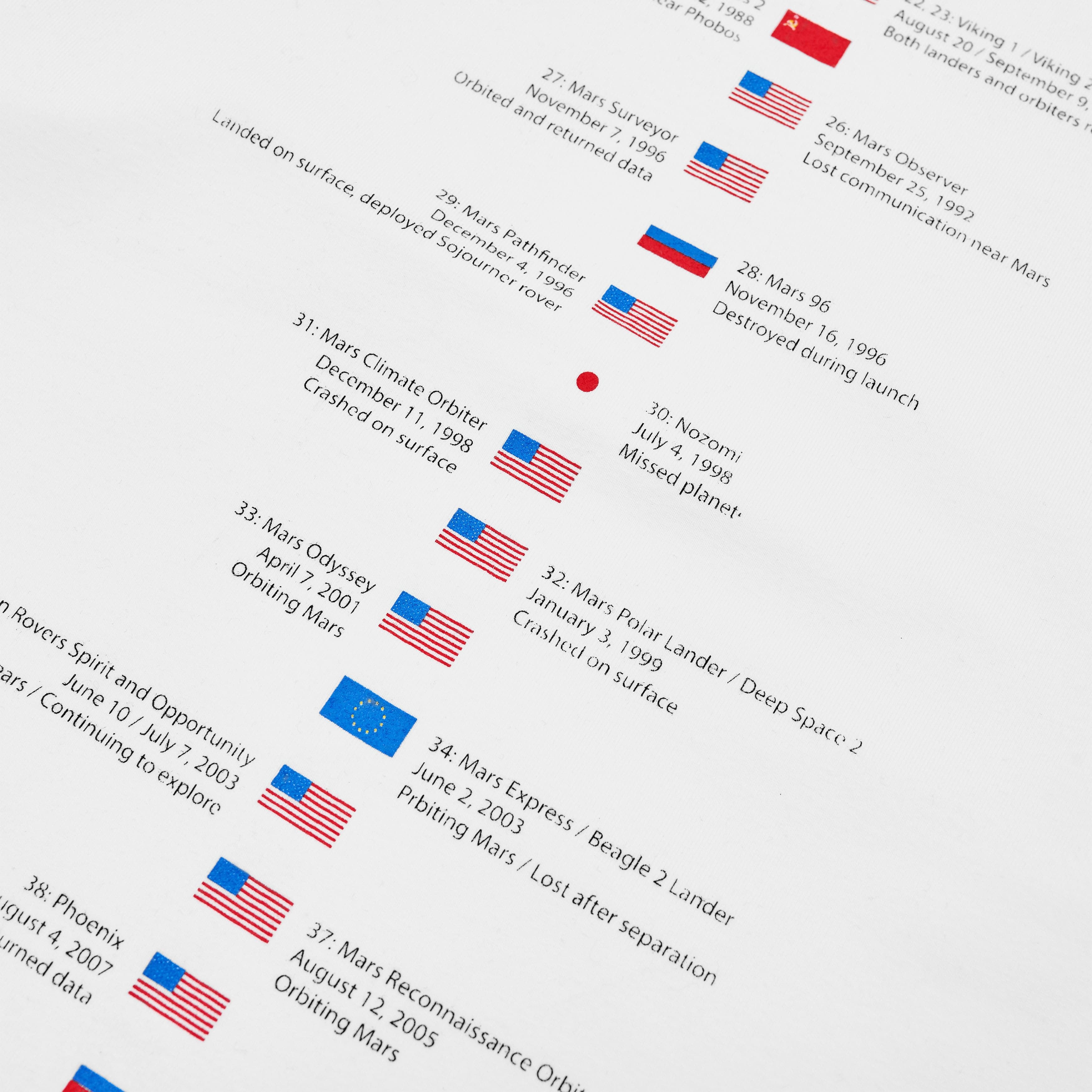 Besonderheiten: Druck mit der Liste aller Länder, die an Starts zum Mars beteiligt sind