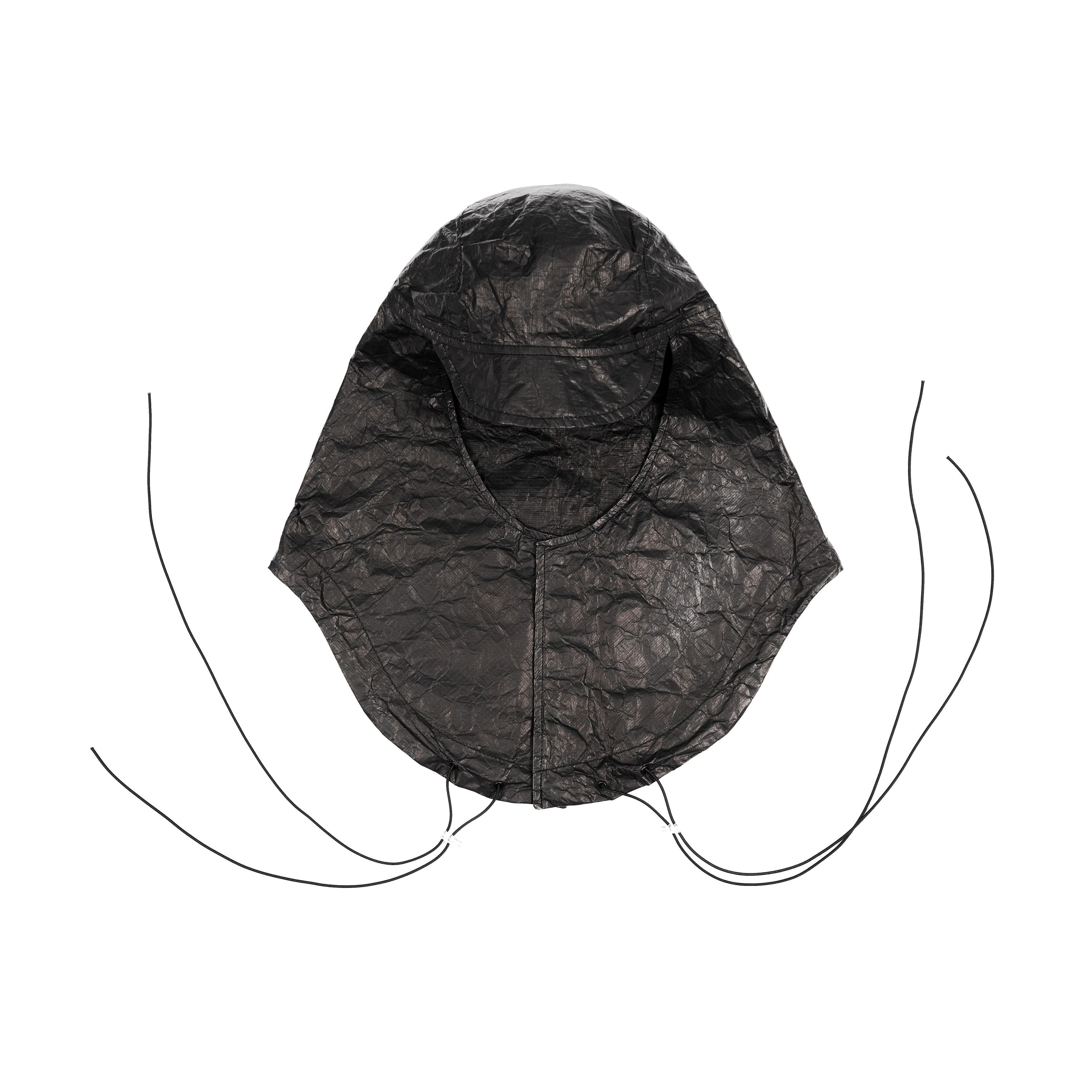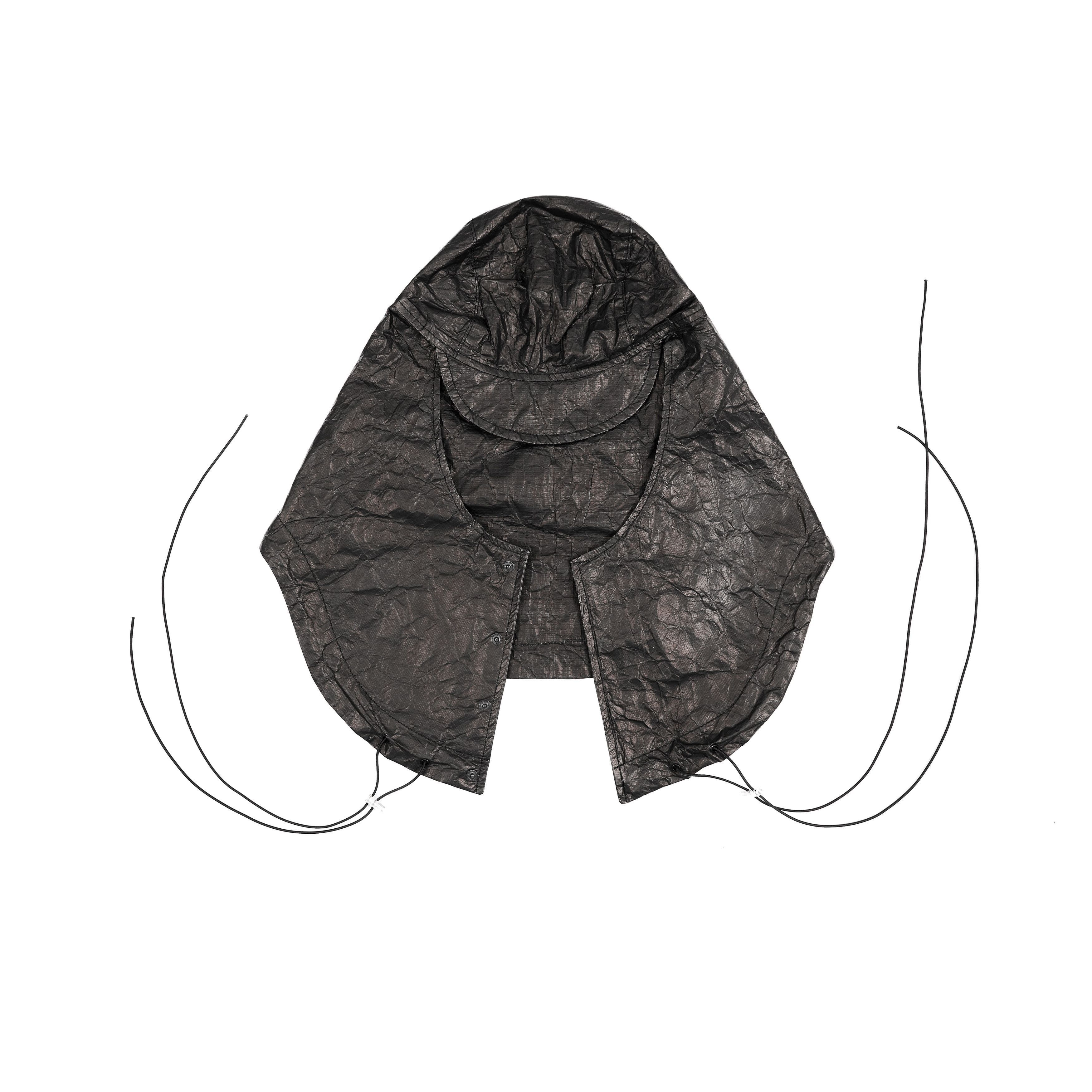 Cap made from soft textured Tyvek. Depending on the weather and your mood, it can function as a hood, hat and a cloak. Protects from wind with its closed neck and collar area. Fits firmly on the head. Hidden size adjustment with metal buttons allows you to wear the cap in an open position. Decorative extended cords. Black accent logo on the back of the head. The external care label is sewn with red thread.
