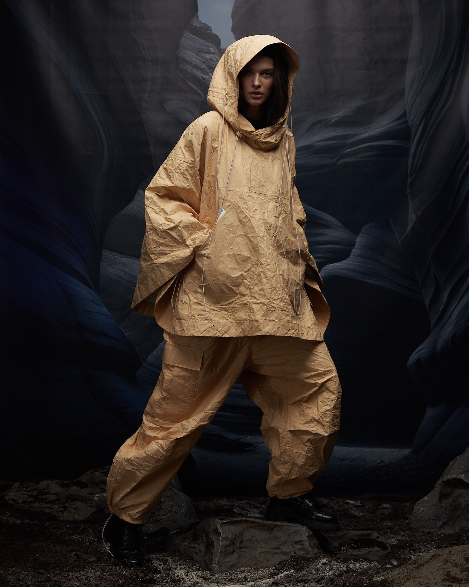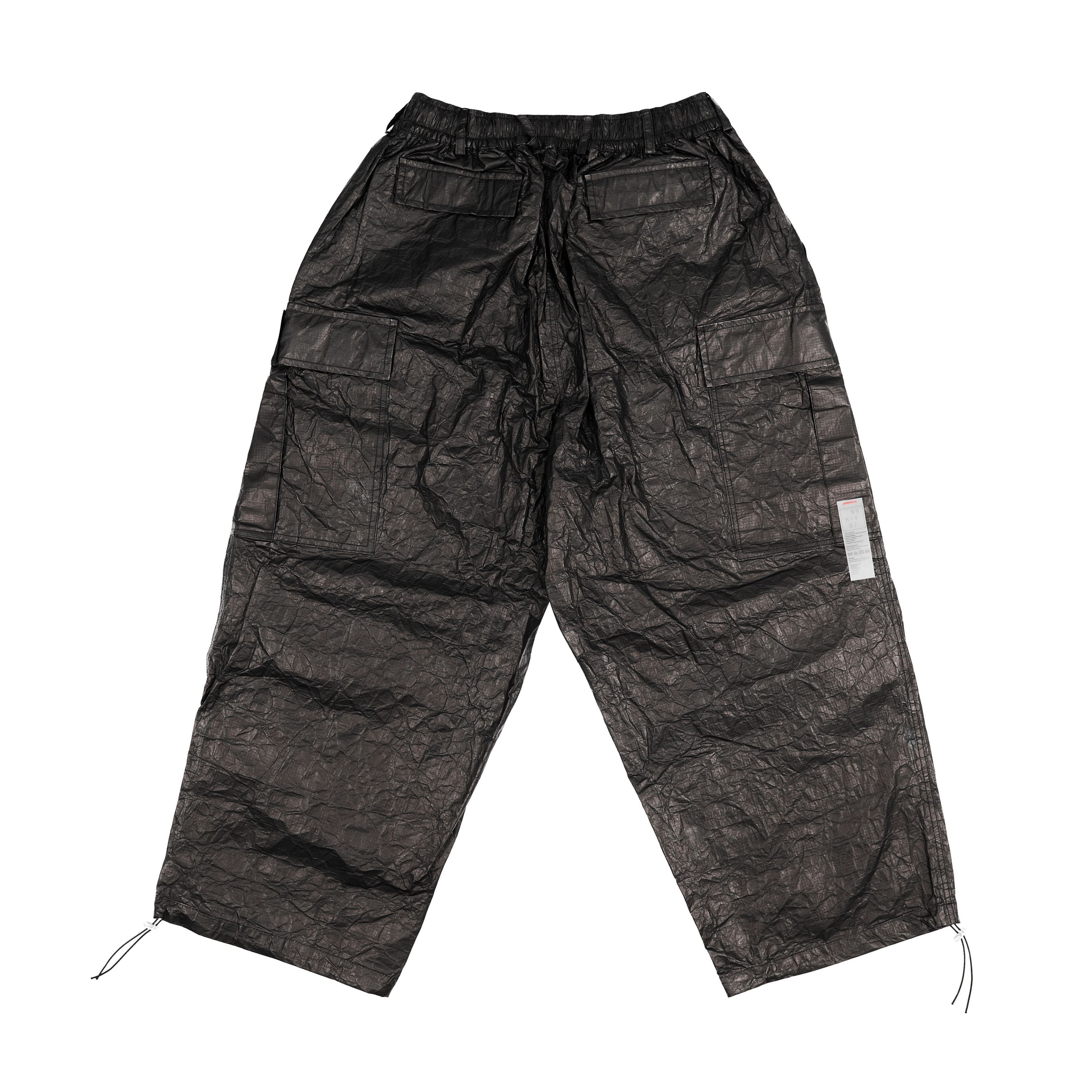 Cargo pants made with soft, textured Tyvek. Large internal and voluminous external pockets on the waist and knees. Adjustment of leg girth. Sturdy rubber band on the waist. Durable metal zipper. Decorative extended cords. Black accent logo on the pocket. The external care label is sewn with red thread.