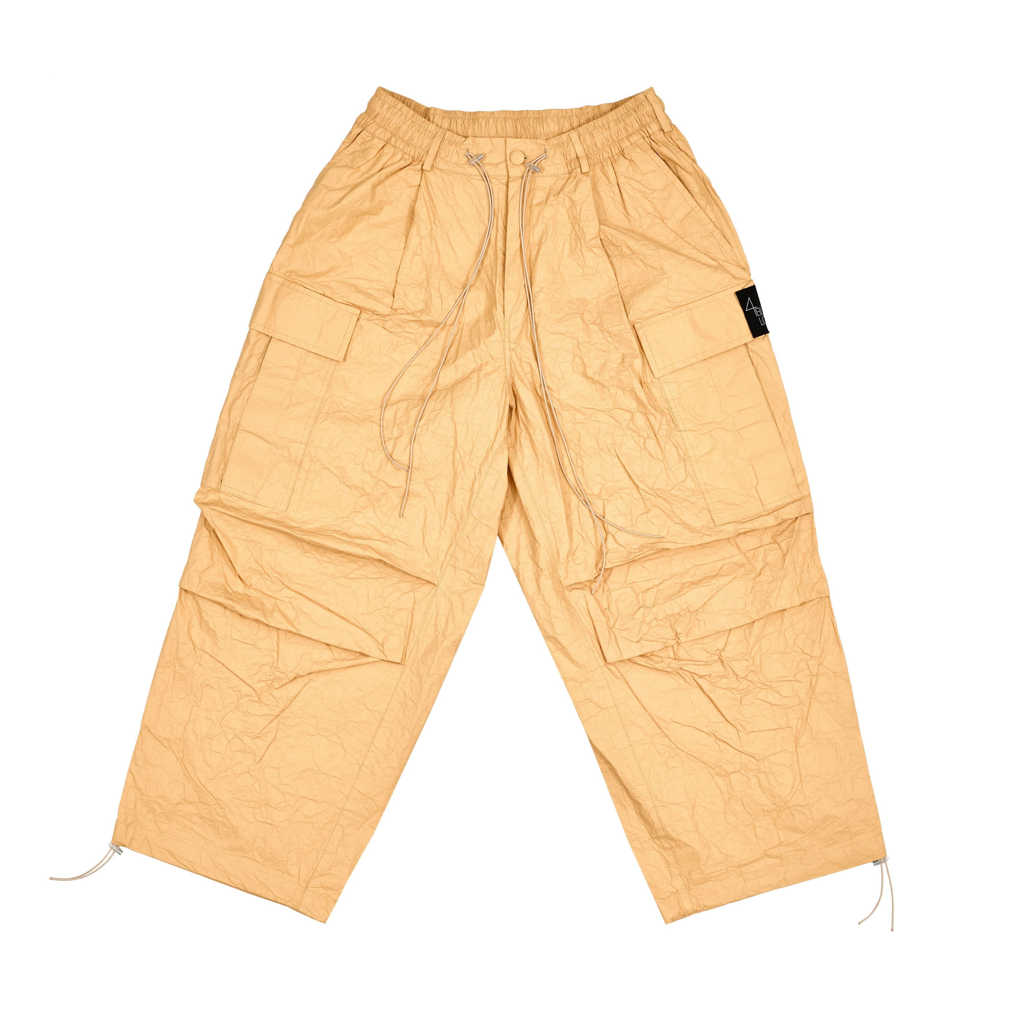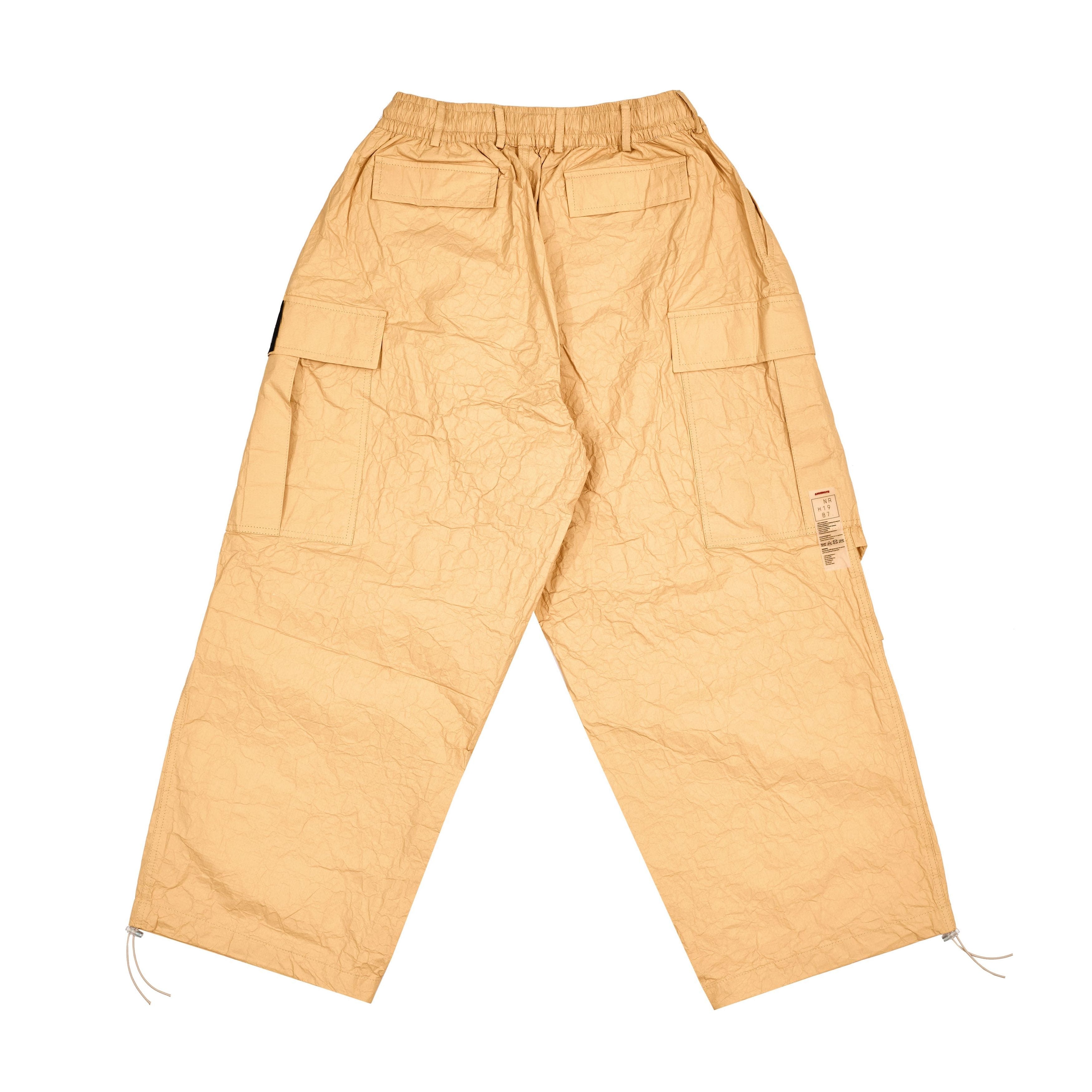 Cargo pants made with soft, textured Tyvek. Large internal and voluminous external pockets on the waist and knees. Adjustment of leg girth. Sturdy rubber band on the waist. Durable metal zipper. Decorative extended cords. Black accent logo on the pocket. The external care label is sewn with red thread.