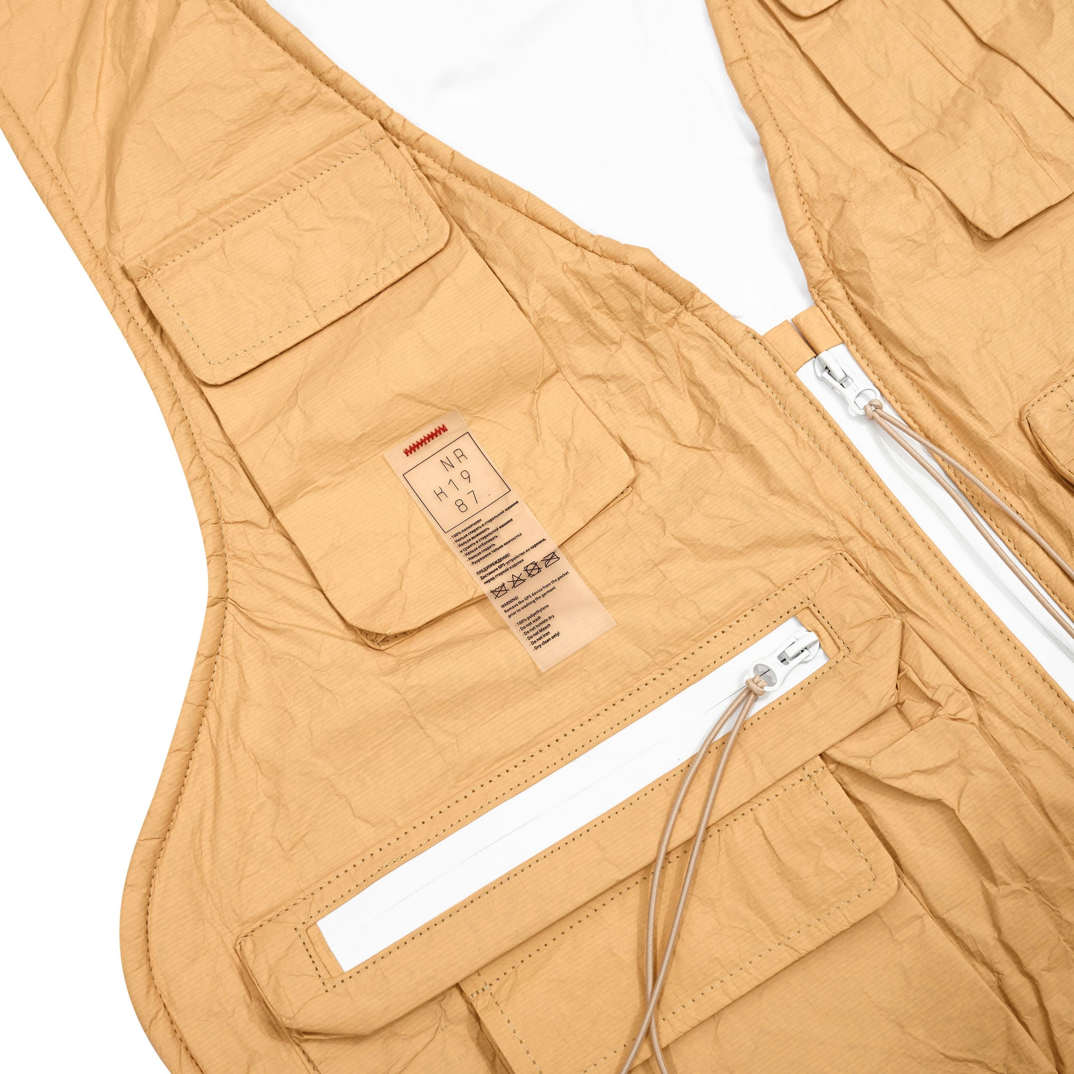 Vest made with soft textured Tyvek. Free silhouette. Voluminous external pockets on the chest and waist. Rubberized waterproof zippers. Decorative fastex fastener for adjustments, connecting the front and back sides of the vest. Extended cords. Black accent logo on the back. The external care label is sewn with red thread.