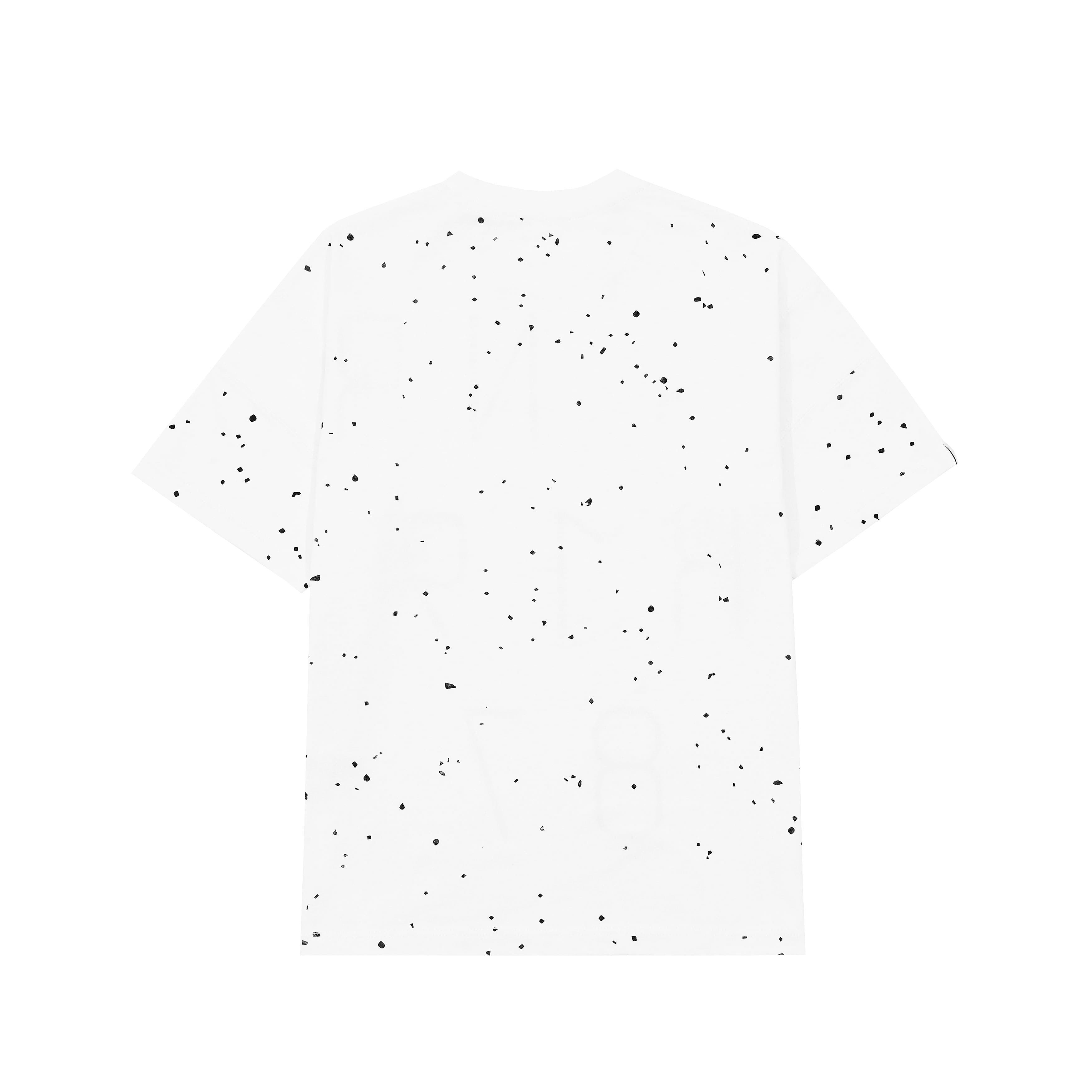 Snow-white T-shirt made of lightweight, smooth cotton. Large logo print and a scattering of mosaic dots. Loose wide silhouette with dropped shoulder seam. Wearable print with added rubber. Inverted fabric inserts at shoulders. Sturdy metal branded hardware. Voluminous double-lined hood. Contrasting cord. Hidden pocket with GPS device and stitched NFC tag under logo.