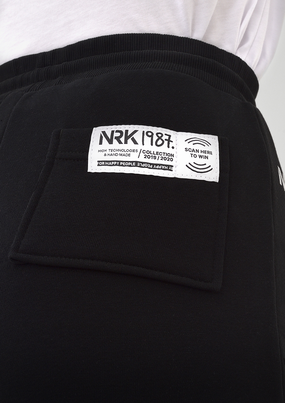 Basic black joggers made of soft footer, branded with the NRK1987 logo. Comfort of wear is provided by a cotton-based fabric, which helps to keep the shape of polyester fibers. Look in harmony with the hoodie NRK1987. similar color.
