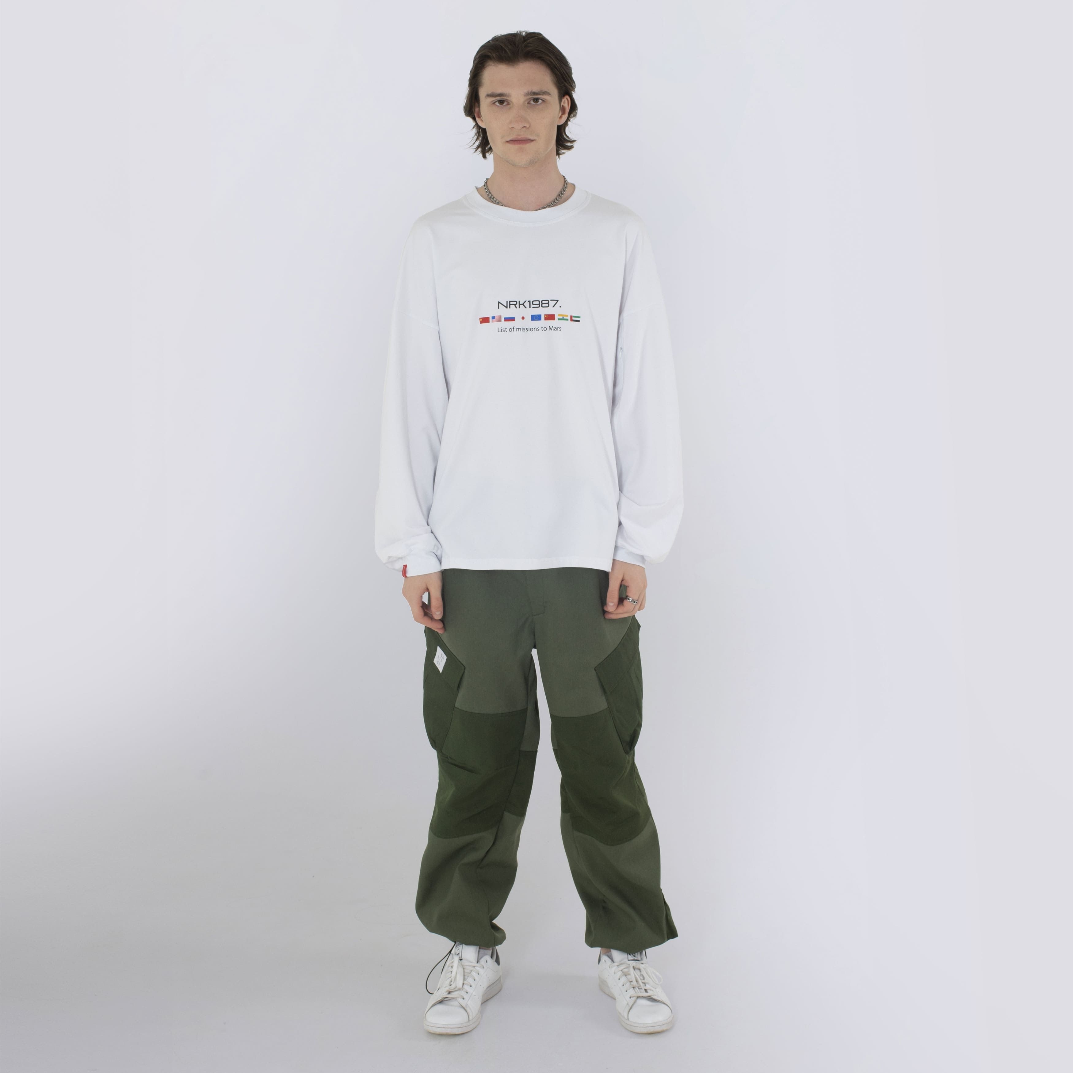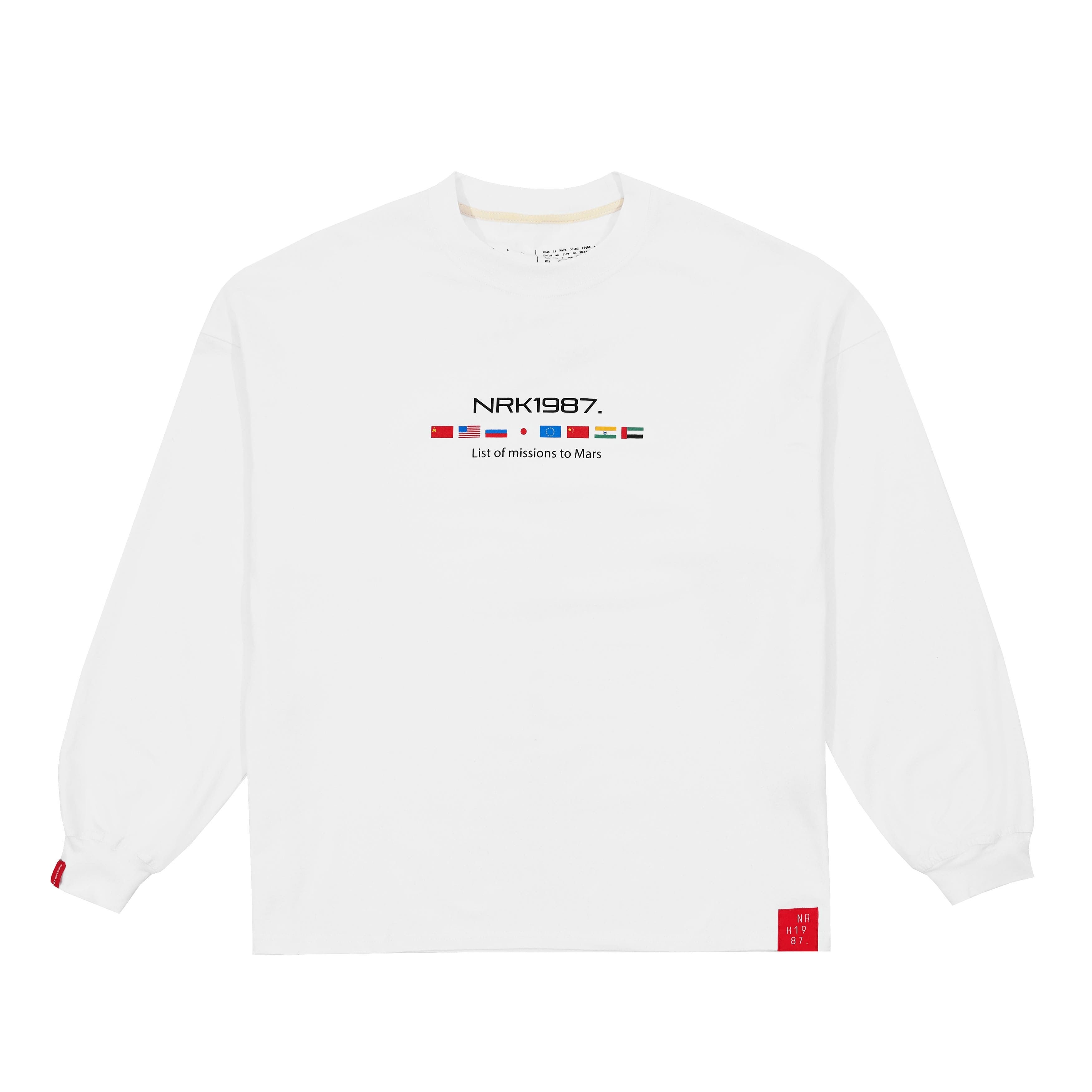 Long sleeve with oversize silhouette. There is a hidden pocket on the sleeve. Features include a print manually applied which depicts all of the countries involved in the launch of missions to Mars.