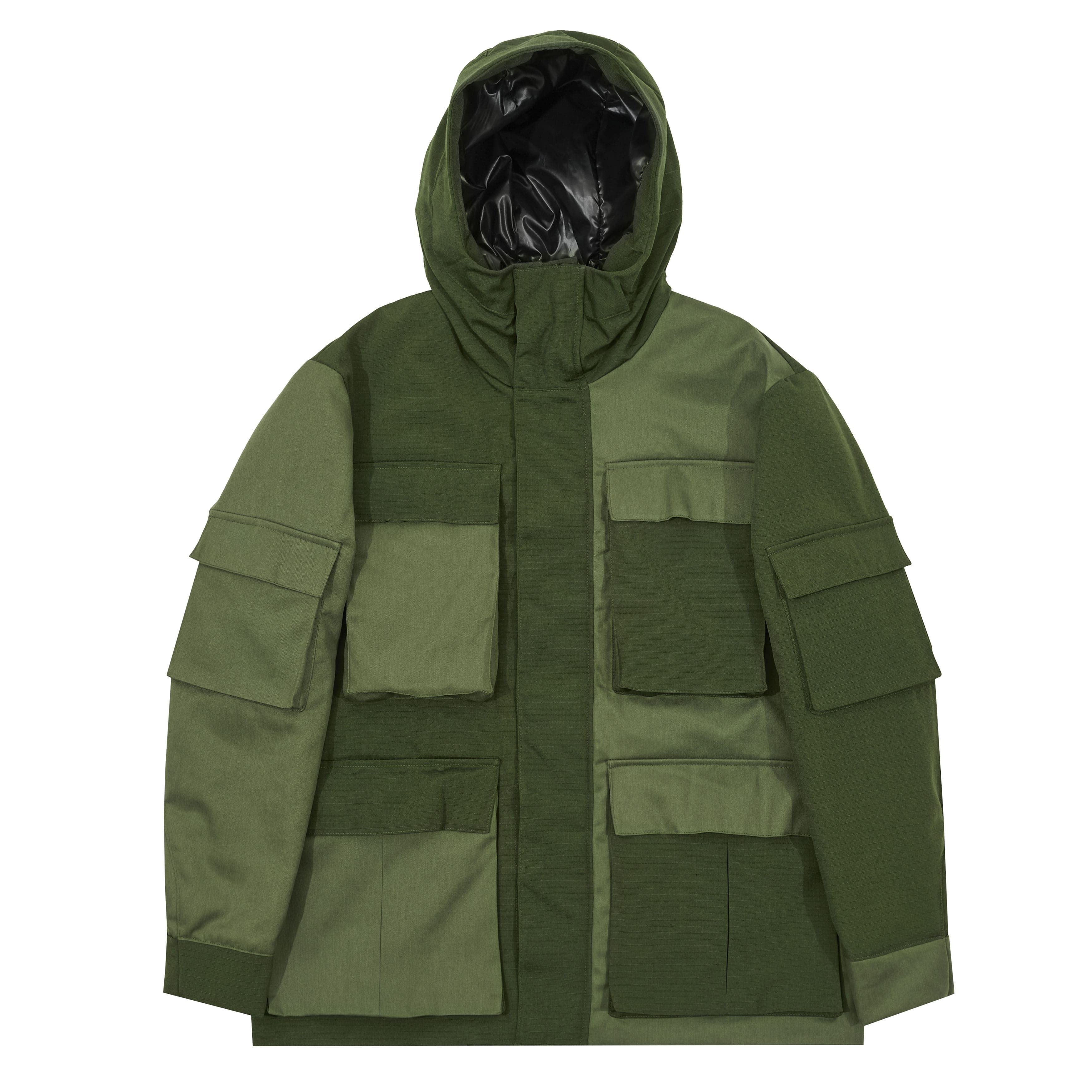White (gradient) and monochrome (khaki) lining. Cuffs, exterior and interior pockets with concealed magnets. Padded bottom and hood. Hidden pocket with GPS device and stitched NFC tag under logo.