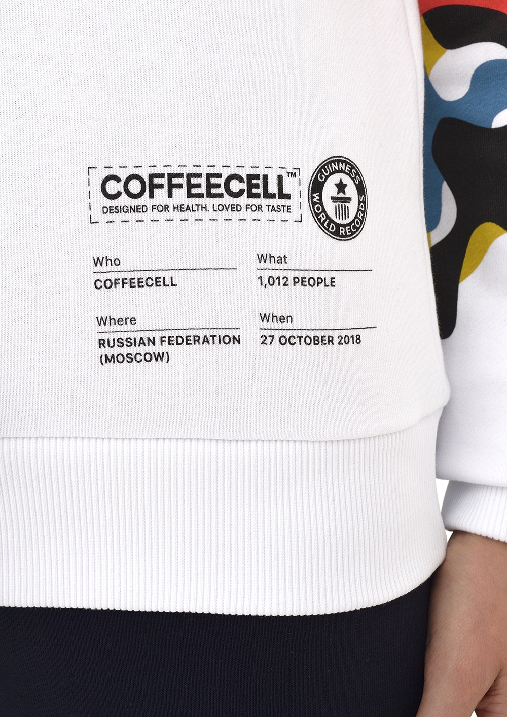 The collaboration of NRK1987. and the brand of health products COFFEECELL is not accidental: COFFEECELL is notable for the fact that the record of attendance at the fashion show set by it is listed in the Guinness Book. Confirmation of this uniqueness — the signature "Official Amazing" from the official diploma of the Guinness World Record-is placed on the front of the sweatshirt made of white soft lining. A copy of the diploma itself is printed on the back and framed with a distinctive bright camouflage print on the sleeves.