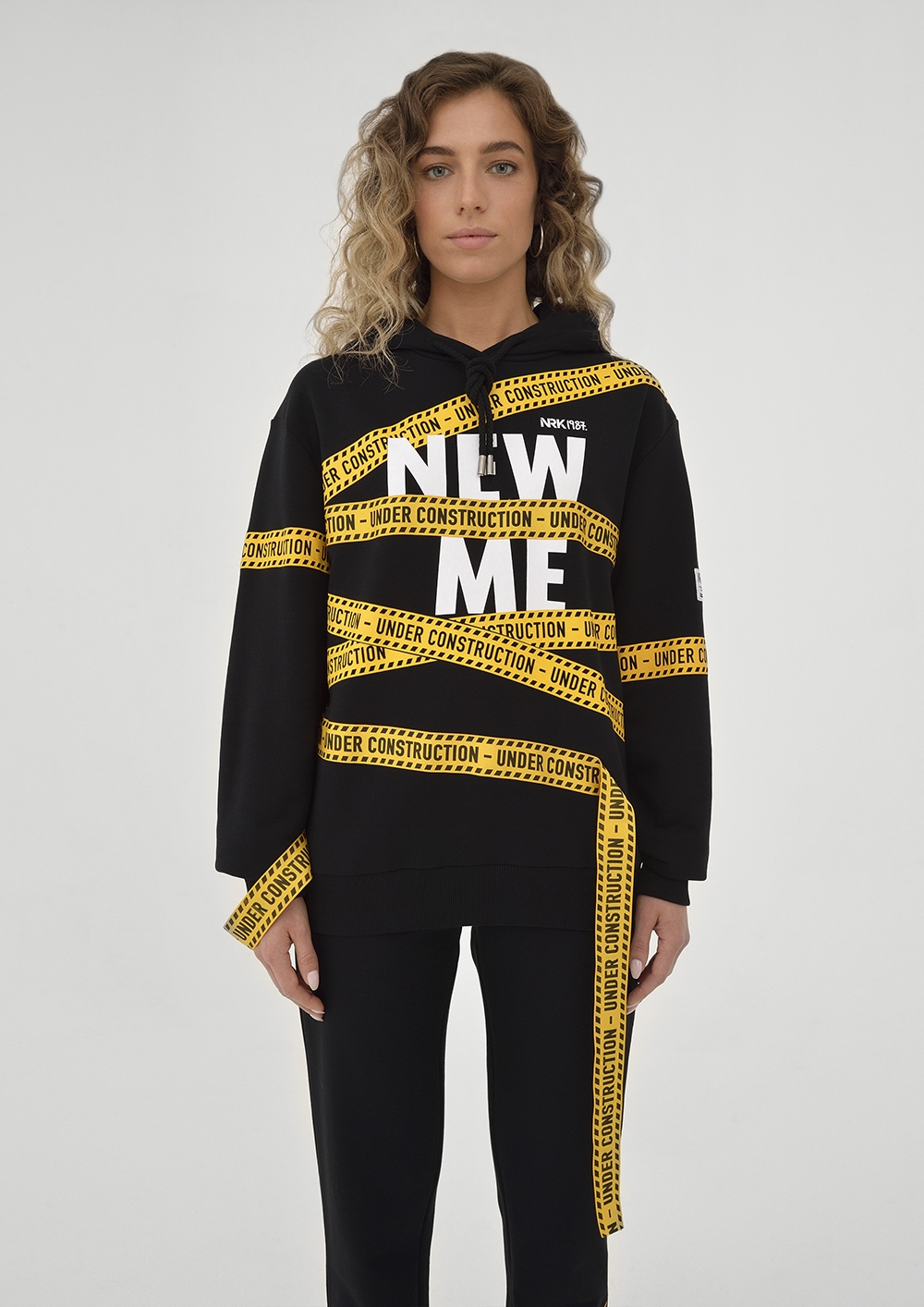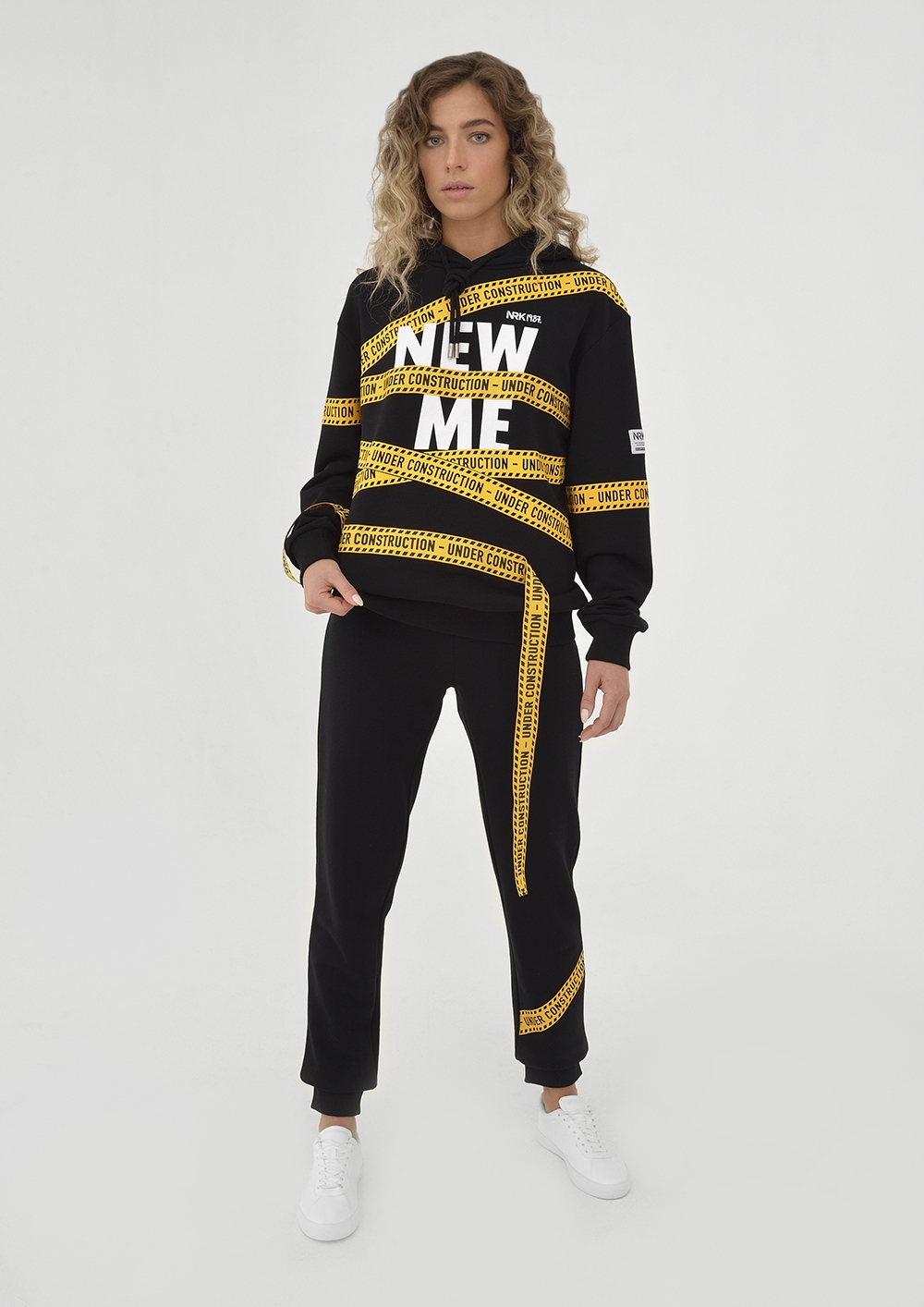A black suit made of soft lining with the inscription NEW ME ("New me") on the chest will become a comfortable everyday clothing for everyone who is in the process of "reconstructing" their inner world. The real yellow warning tape with the UNDER CONSTRUCTION seal gives the model a 3D effect and symbolizes the idea of constant self-improvement.