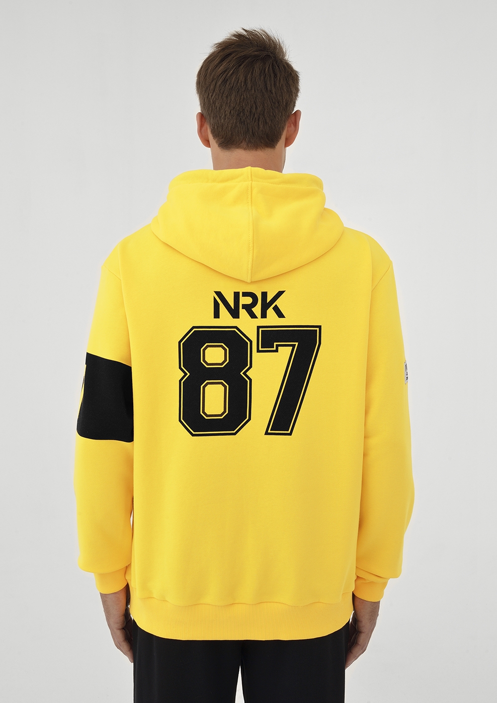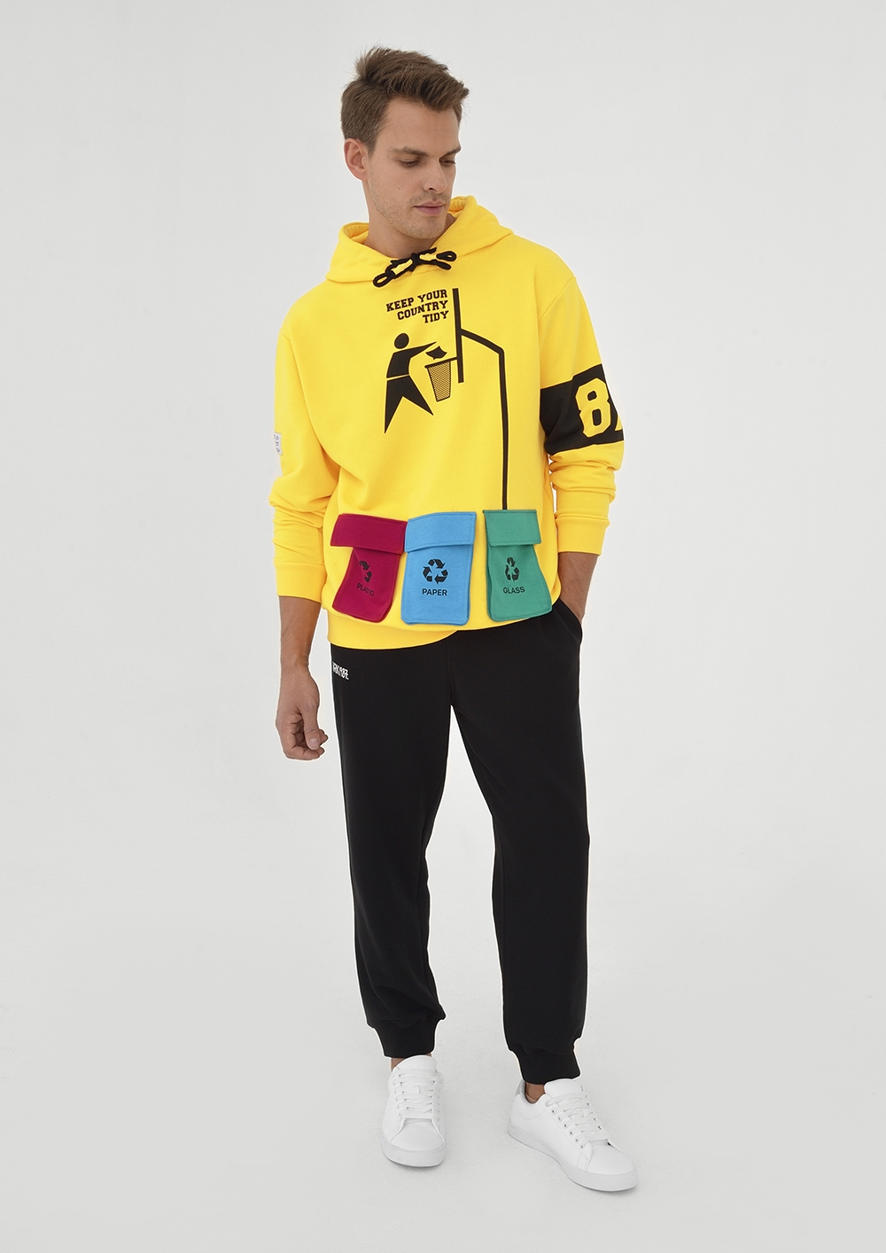The theme of environmental protection found its creative embodiment in a bright yellow hoodie made of soft footer. Three roomy patch pockets (red, green, turquoise) imitate containers for sorting waste. And the popular pictogram "Throw garbage in the basket" calls for not polluting nature and originally plays on the world-famous image of an athlete soaring over a basketball hoop. The basketball theme is organically continued by the branded sports numbers on the back and on the sleeve of the model.