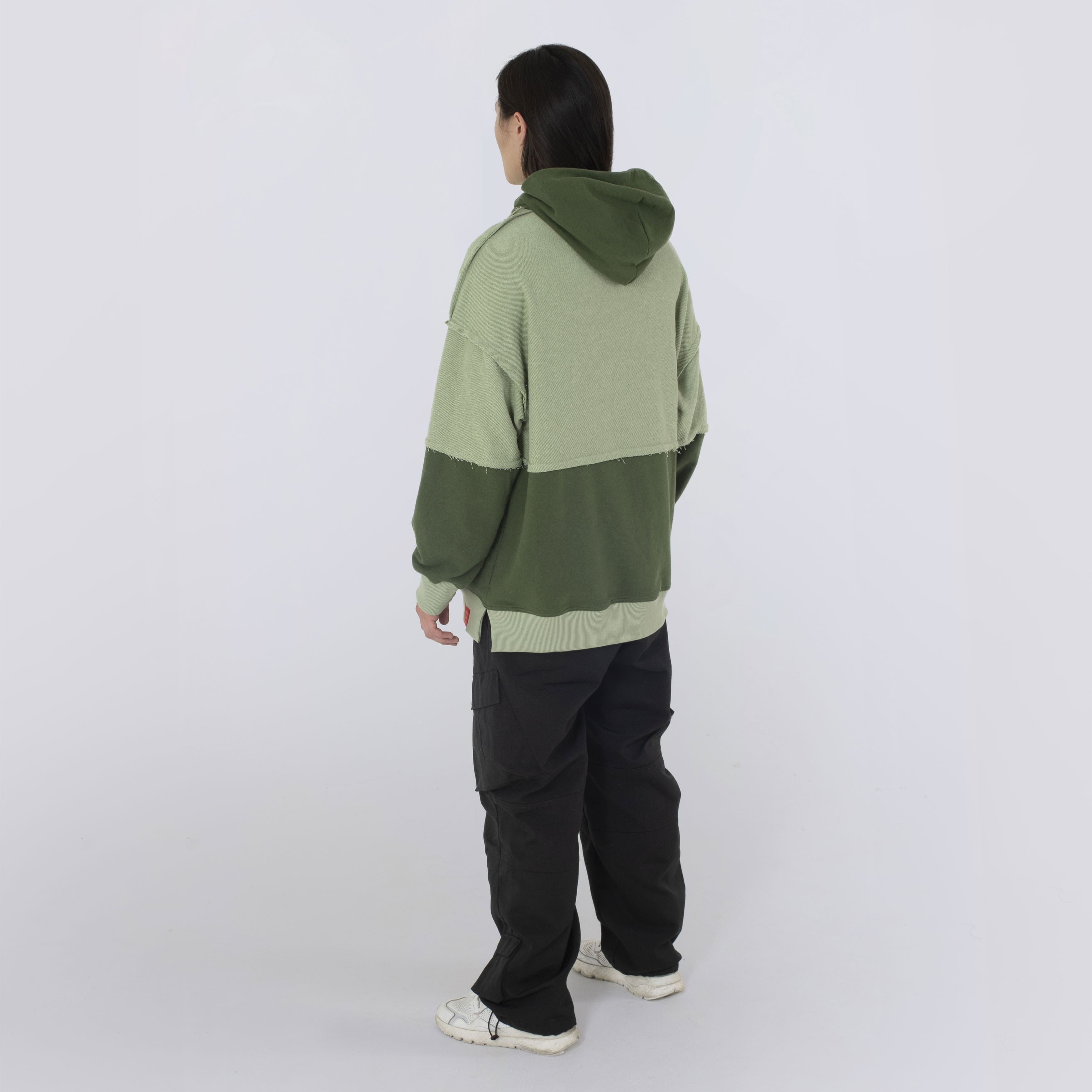 Colorblock sweatshirt in two lightweight cotton fabrics: khaki and olive. One of the colors is flipped inside out. Intentionally highlighted open seams. Wide oversize silhouette. Offset shoulder seam and increased sleeve volume. Slits at the bottom of the sides of the elastic band. Large volume hood without drawstrings. The side seams of the product are zippered pockets. Hidden pocket with GPS device and stitched NFC tag under logo.