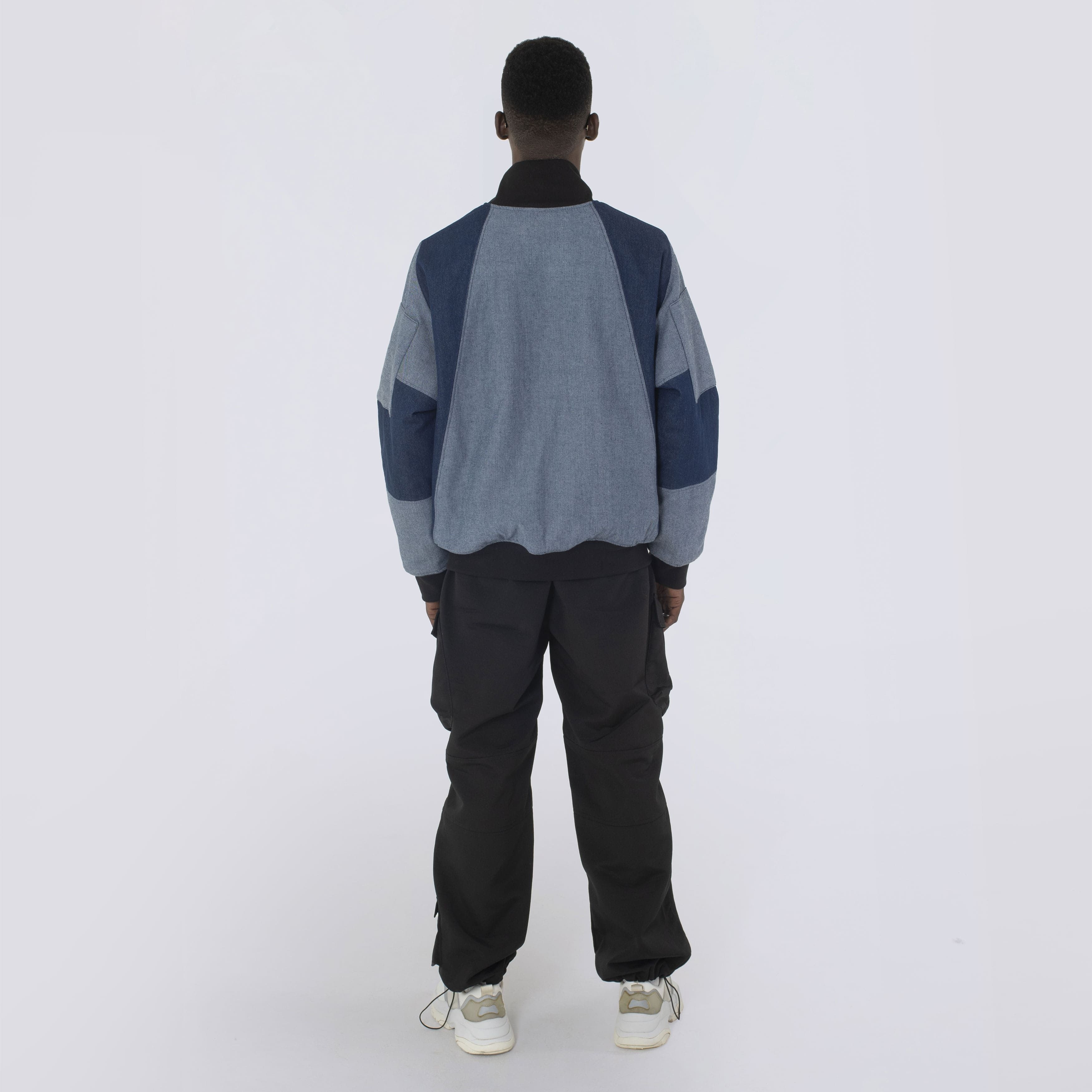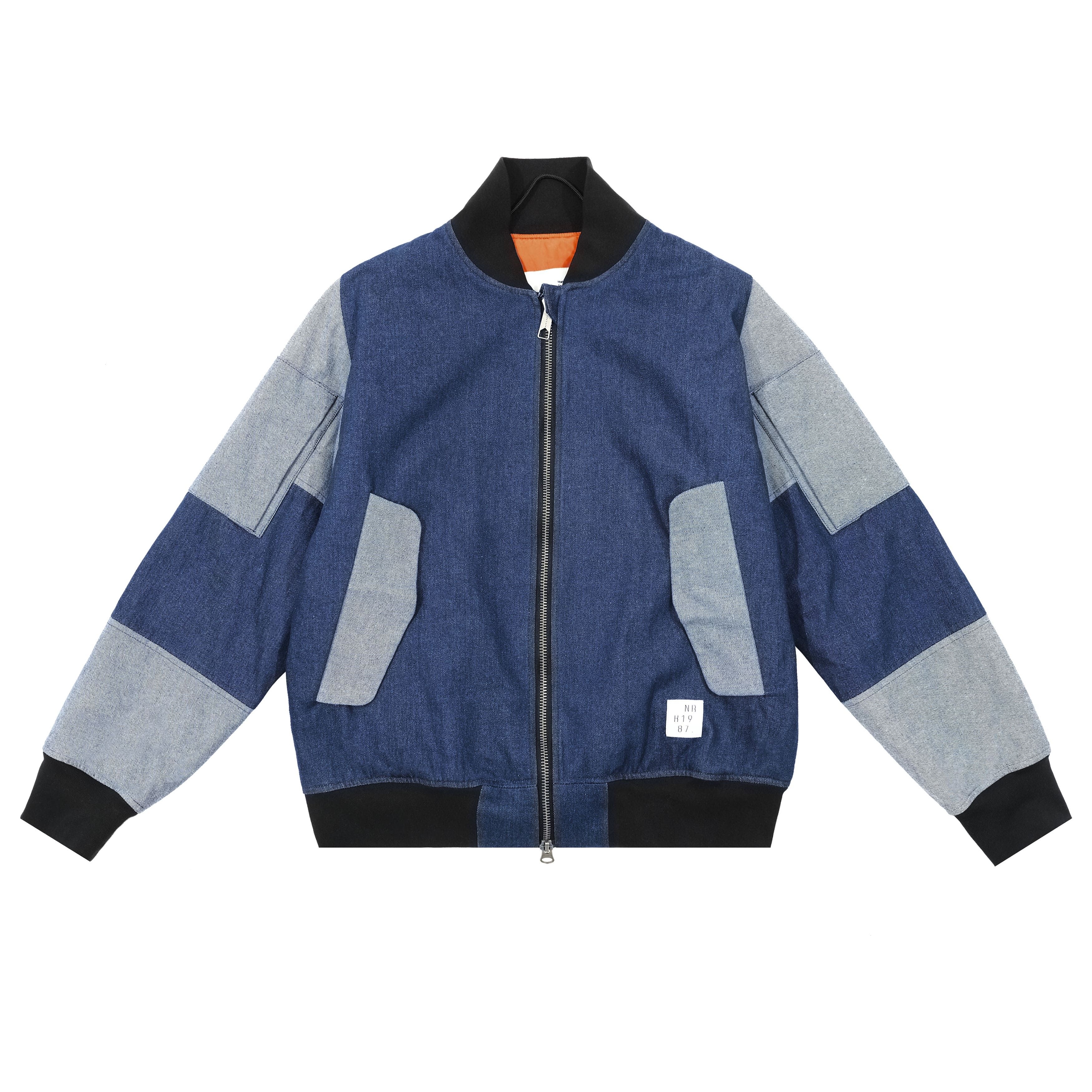 Lightweight bomber in two colorblocks: blue denim and ultralight reflective. Loose silhouette, elasticated sleeve cuffs. Sturdy branded hardware, secure double-lock metal tractor zipper. Orange lining. Plenty of exterior and interior pockets with hidden magnets. Hidden pocket with GPS device and stitched NFC tag under logo.