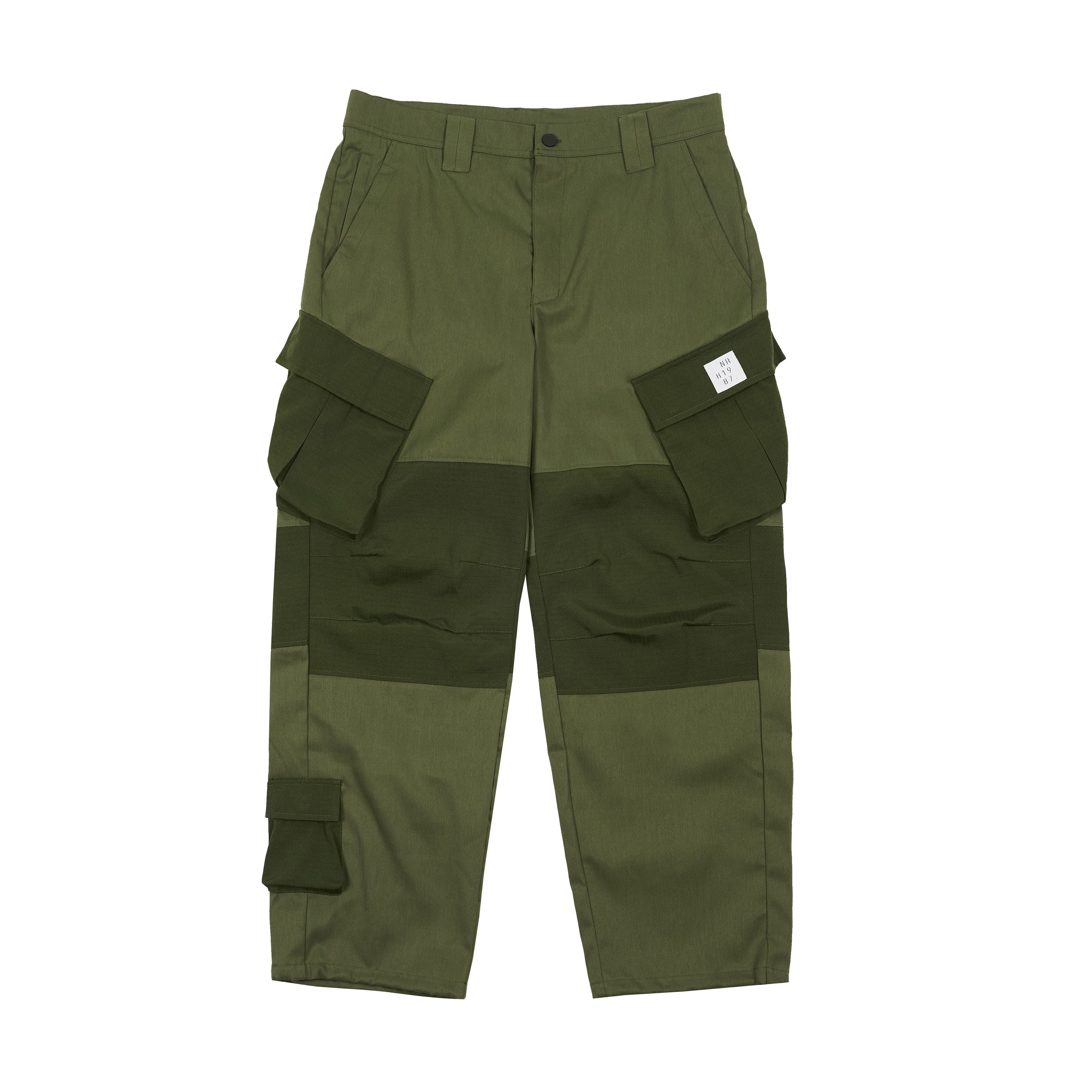 Wide cardo pants in two colors: a colorblock version in a green shade and an all-black version. Lots of voluminous pockets of different sizes - for small and quite large things. All pockets exclusively with hidden magnets. Anatomic inserts on the knees.