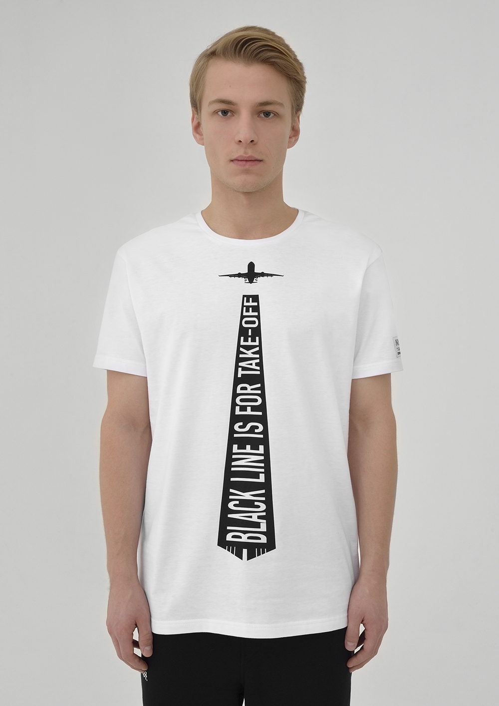 The versatile basic T-shirt gets a strong motivational accent thanks to the contrasting image of the tie with the inscription "Black line is for take-off". Any black stripe can turn into a runway. The main thing is not to wait, but to act!