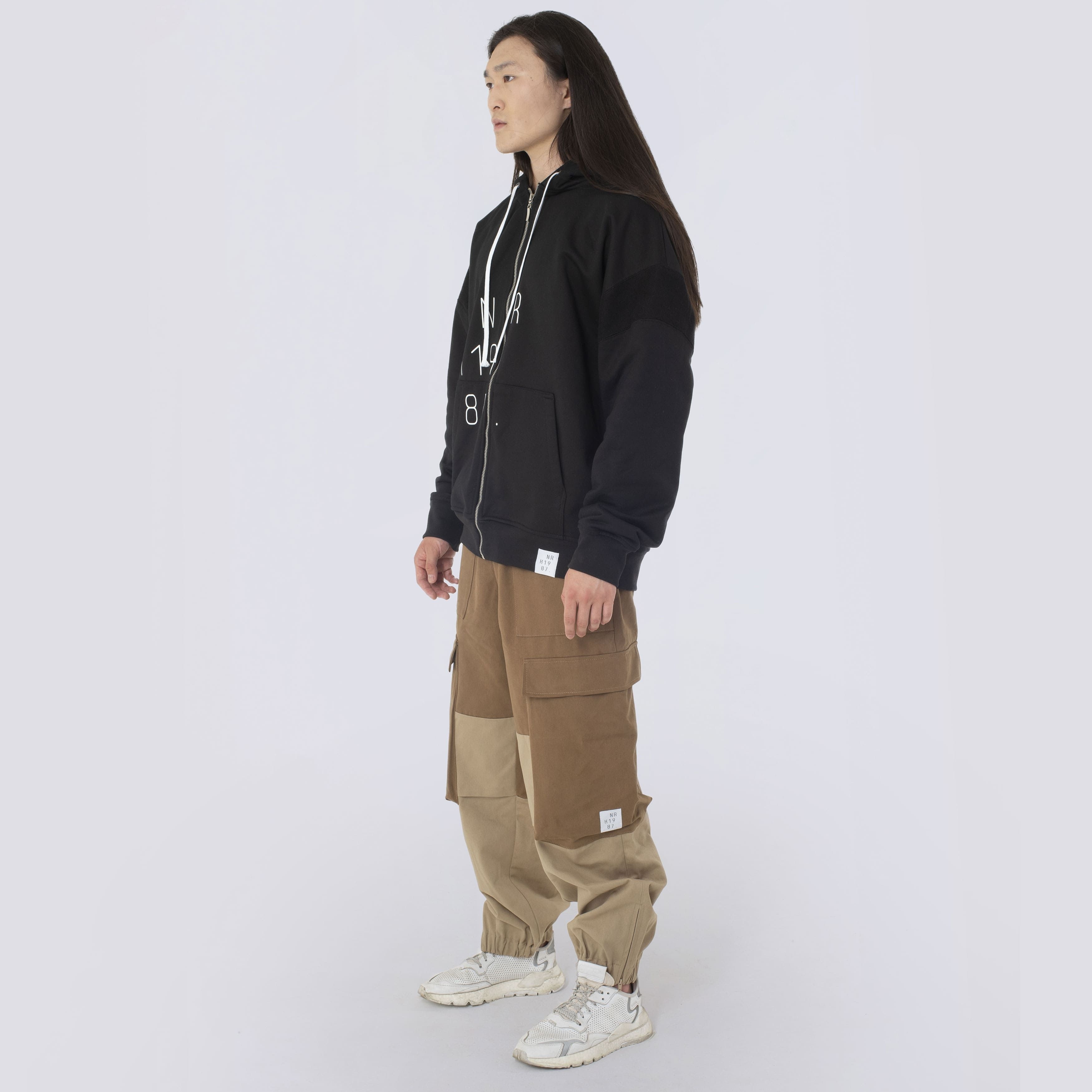 Pants in two colors: black denim and sand dense tweed. Anatomic inserts at the knees. Many pockets with concealed magnets. elastic band at the bottom. Side zippers for volume adjustment.