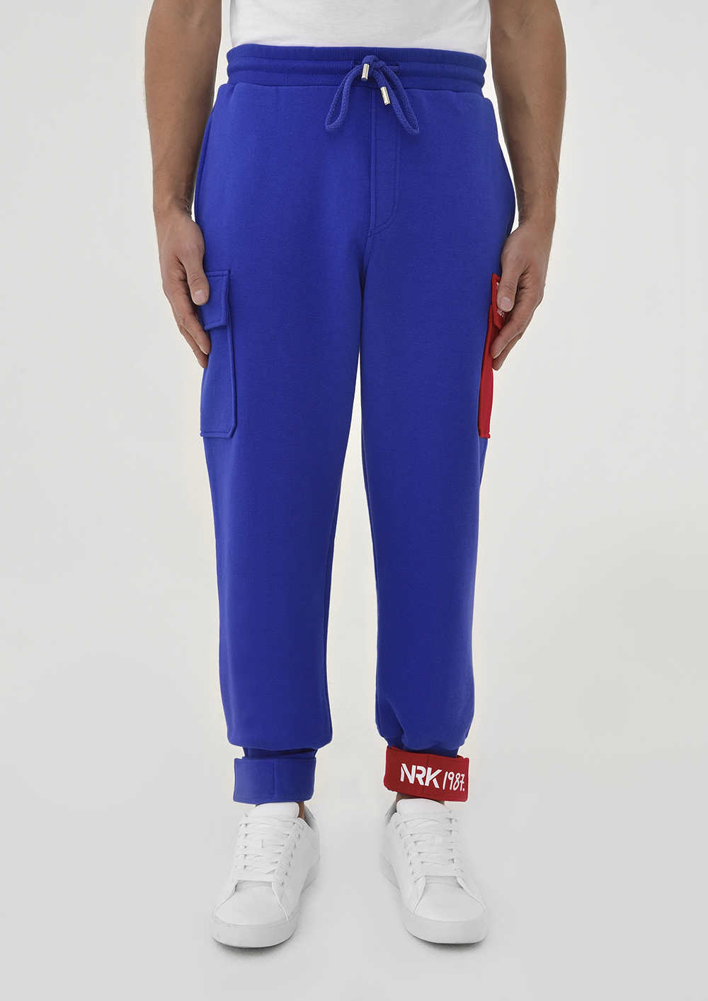 На джоггерах два накладных плоских кармана с клапанами по бокам (один красный), один накладной карман сзади