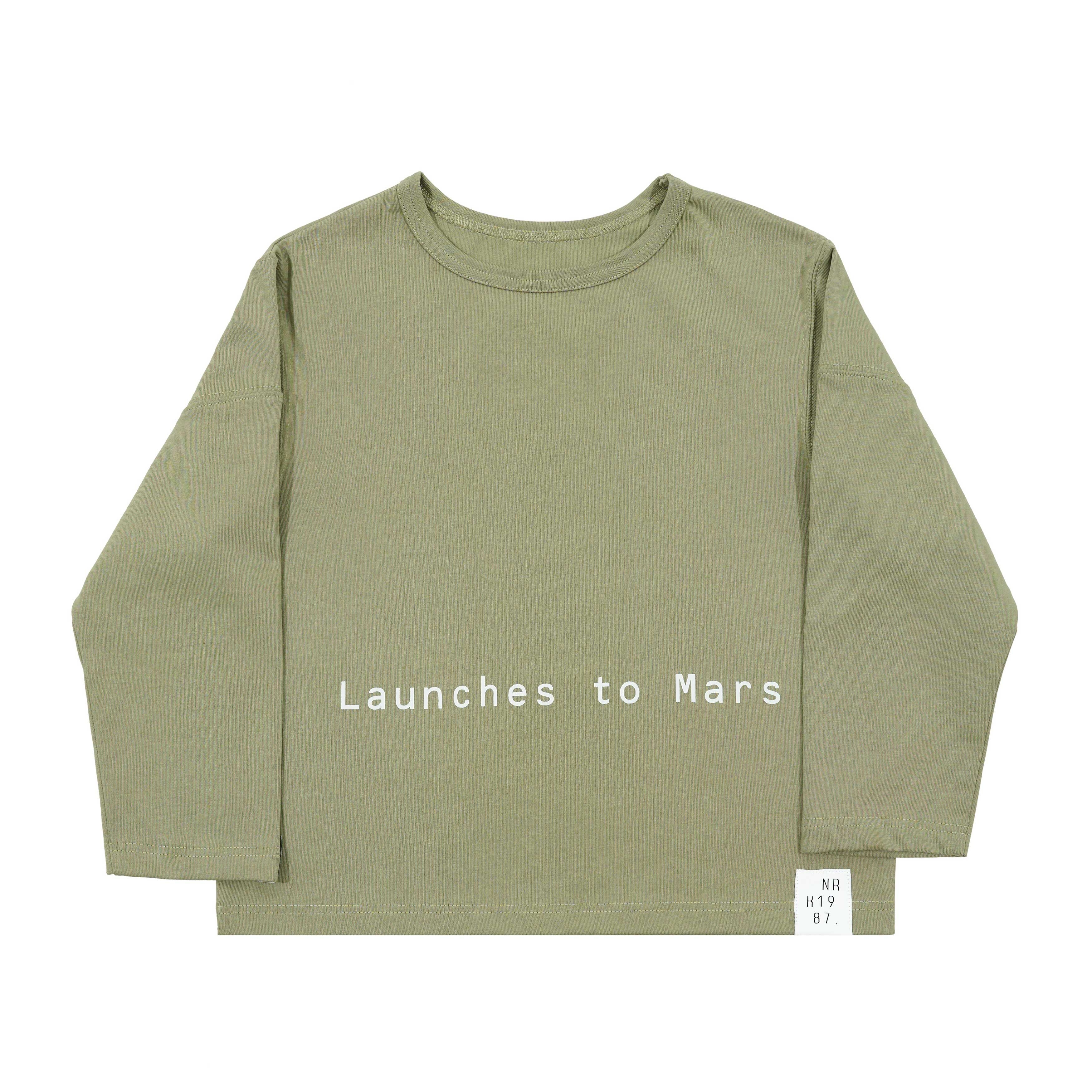 Оливковый лонгслив из легкого гладкого хлопка. На груди и спине принты посвященные Марсу. Свободный широкий силуэт со спущенным плечевым швом. Износостойкие принты с добавлением резины. Вставки из перевернутой ткани на плечах.