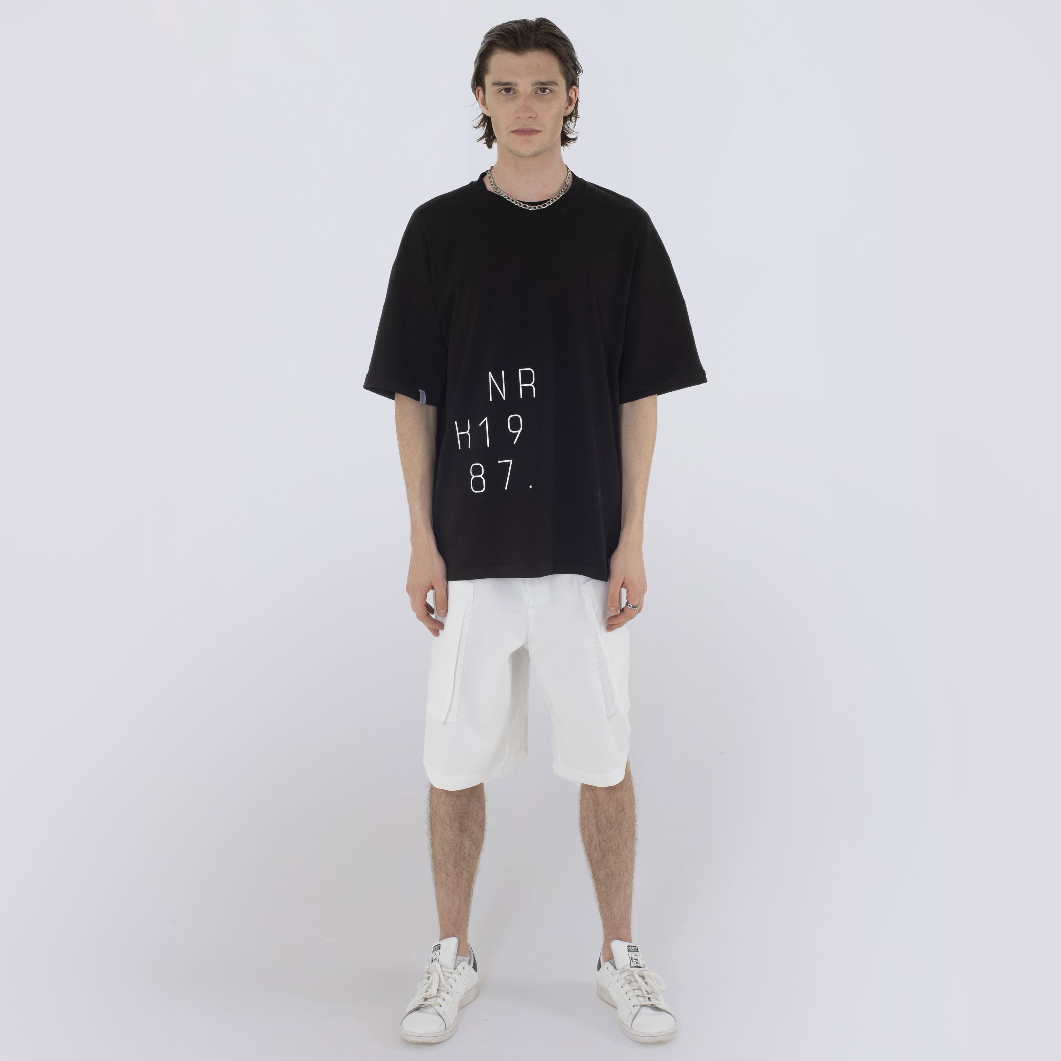 Футболка (к/р) из плотного хлопка черного цвета. Свободный широкий силуэт со спущенным плечевым швом. Износостойкие принты с добавлением резины. Вставки ткани на плечах. Зашитая NFC метка под лого.