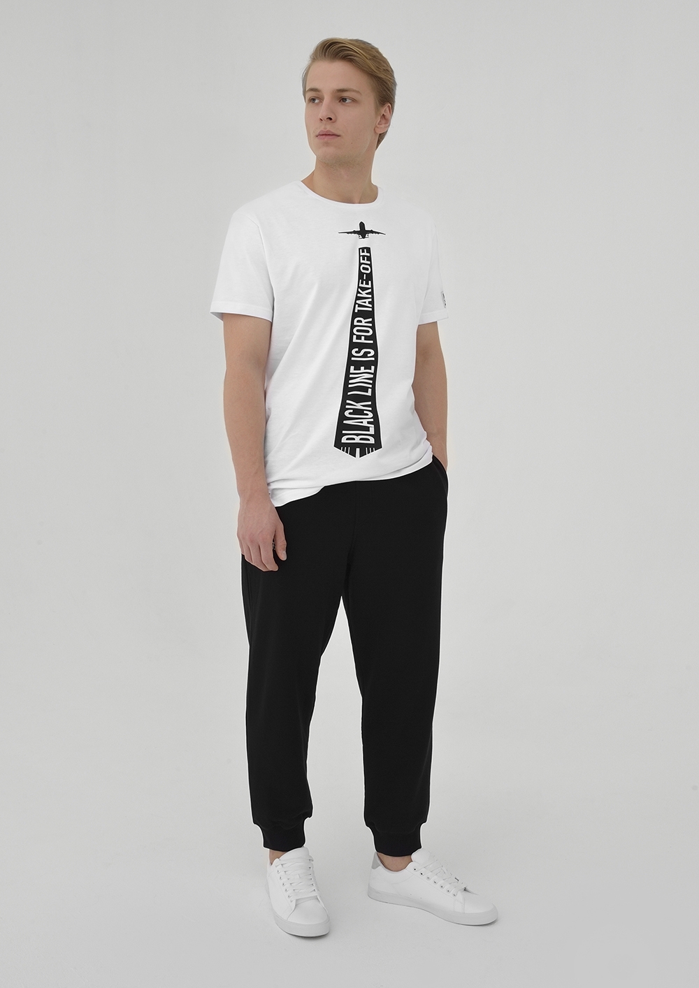 Универсальная базовая футболка приобретает сильный побудительный акцент благодаря контрастному изображению галстука с надписью «Black line is for take-off». Любая черная полоса может превратиться во взлетную. Главное, не жди, а действуй!