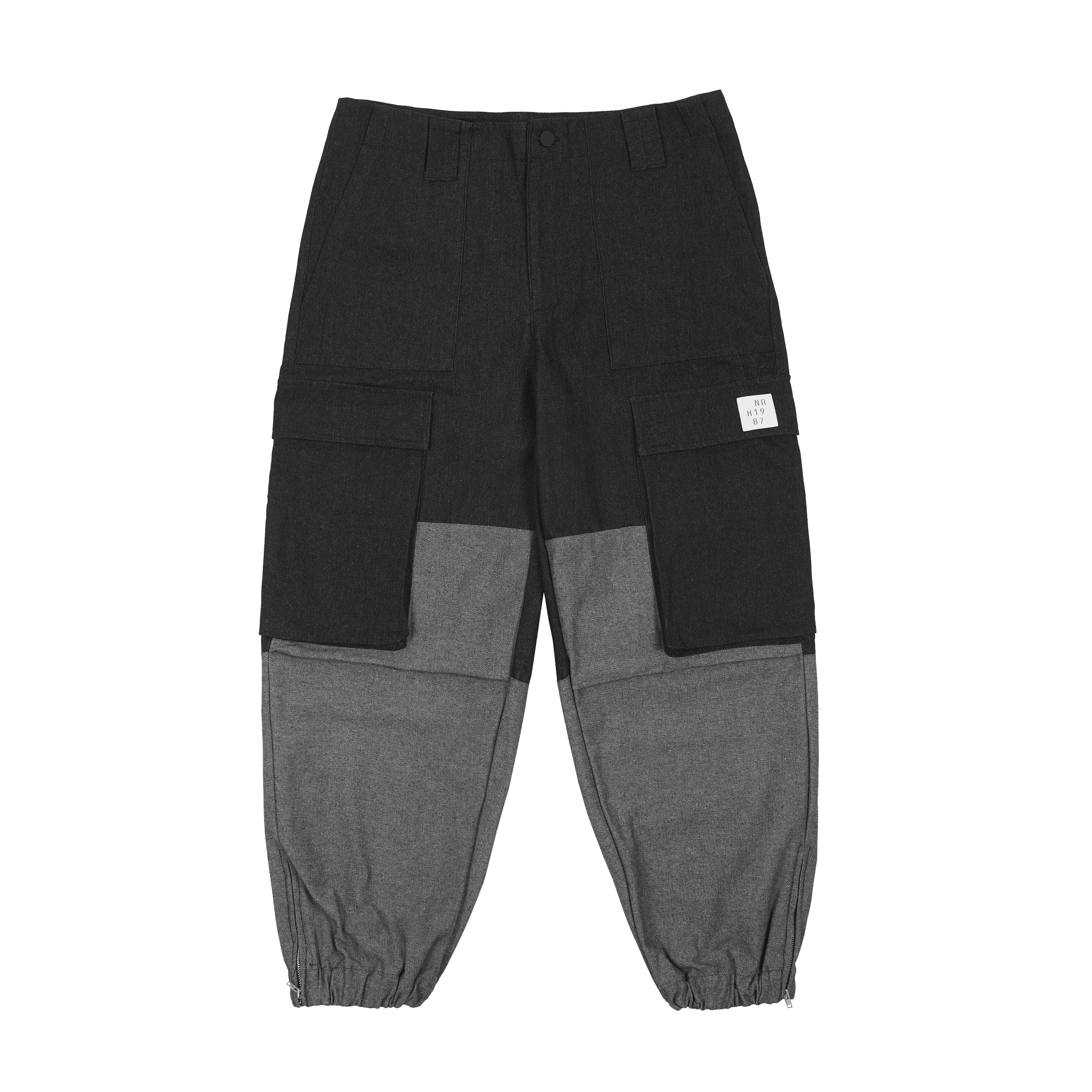 Брюки в двух цветовых решениях: черный деним и песочный плотный твил. Анатомические вставки на коленях. Множество карманов на скрытых магнитах. Манжеты-резинки внизу. Боковые молнии для регулировки объема.