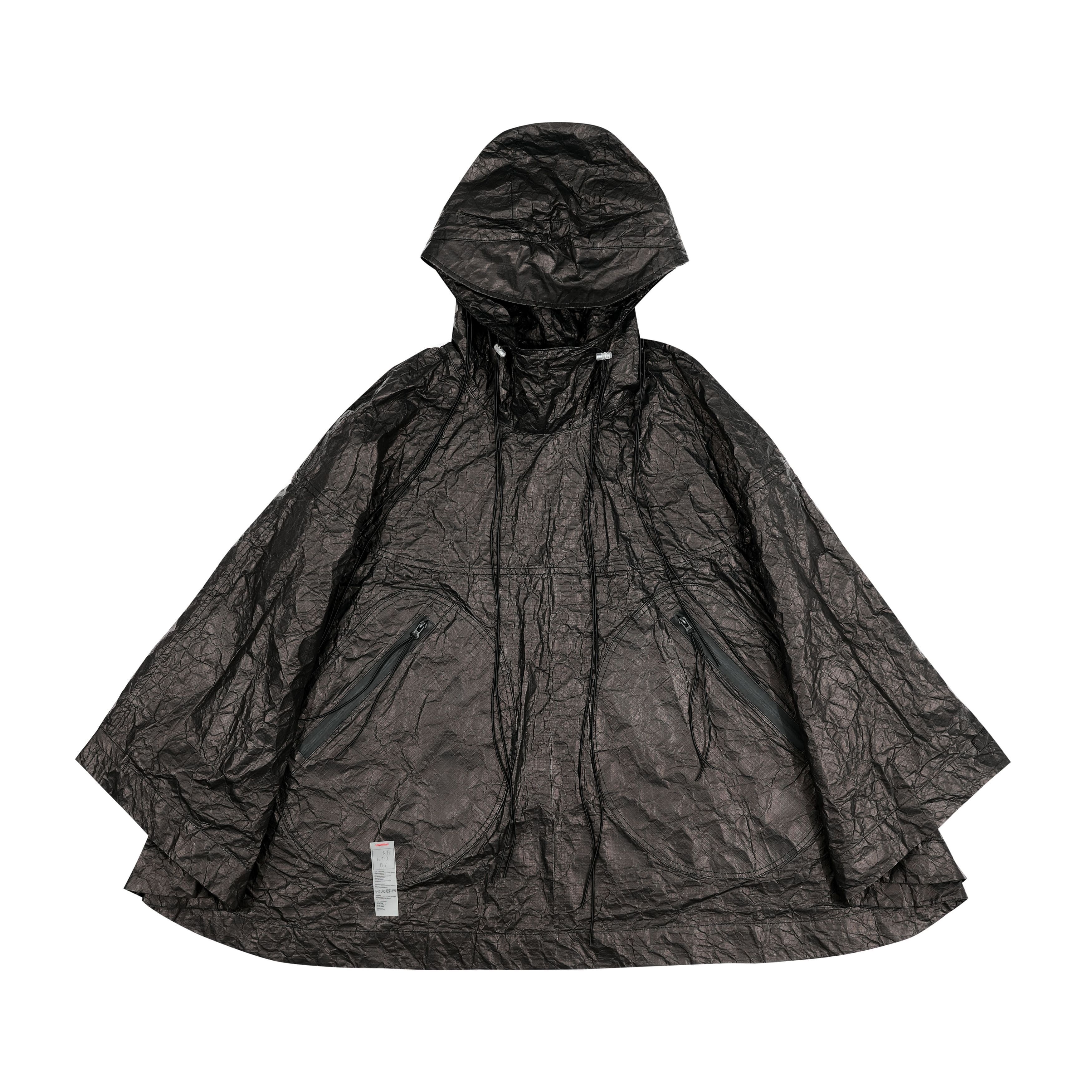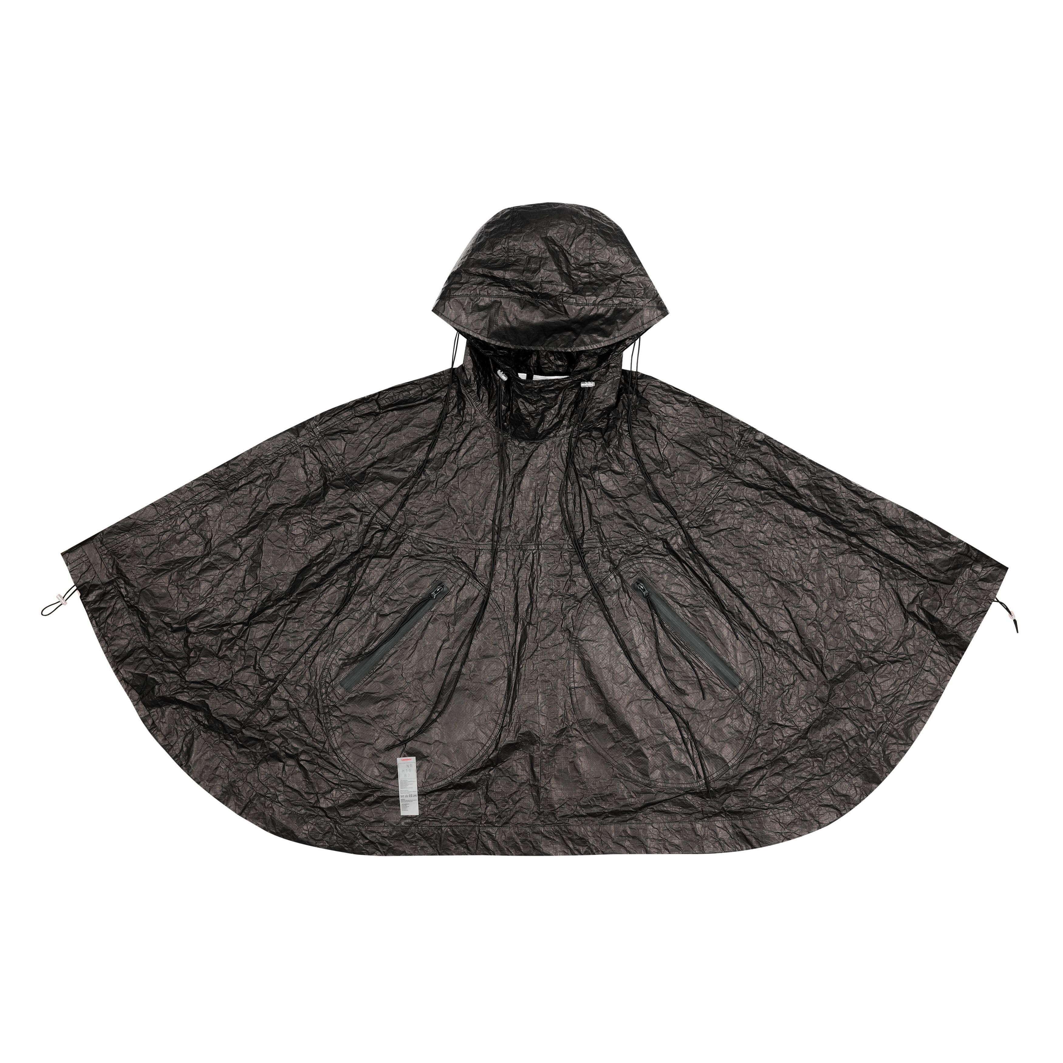 Áo choàng poncho nhẹ từ vải mềm tyvek. Kiểu dáng rộng thoải mái. Mũ trùm với phần lưỡi trai đàn hồi tạo cảm giác thân hình dài hơn. Thiết kế vạt áo theo phong cách không cân xứng. Túi áo to phía ngoài. Khóa kéo chống nước được phủ cao su. Dây buộc trang trí kéo dài. Logo nổi bật màu đen ở phía sau lưng. Nhãn care label phía ngoài được khâu bằng chỉ đỏ.
