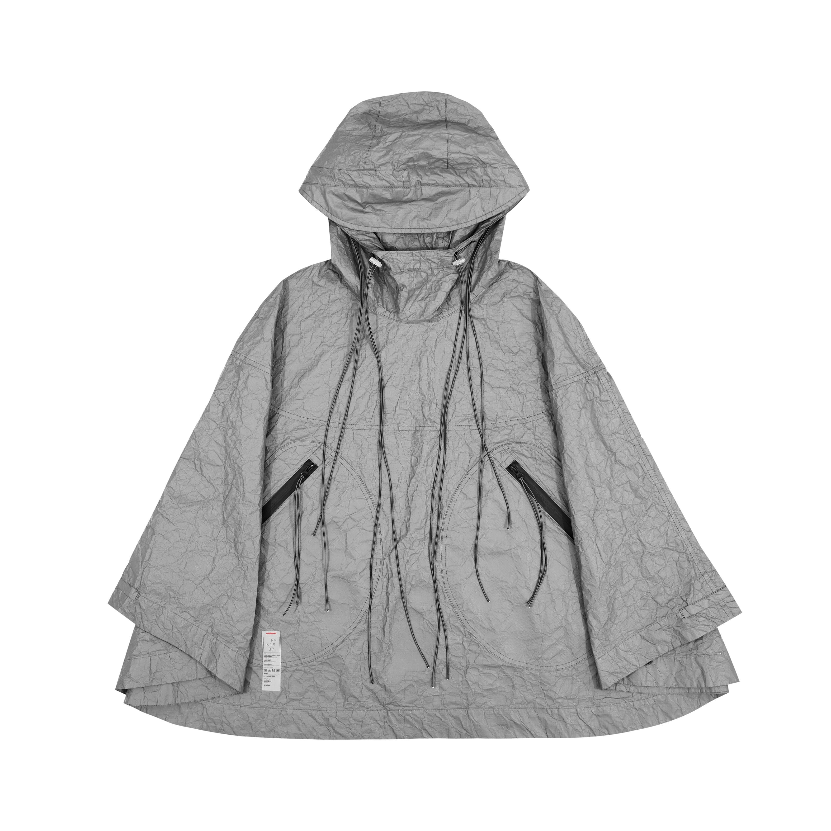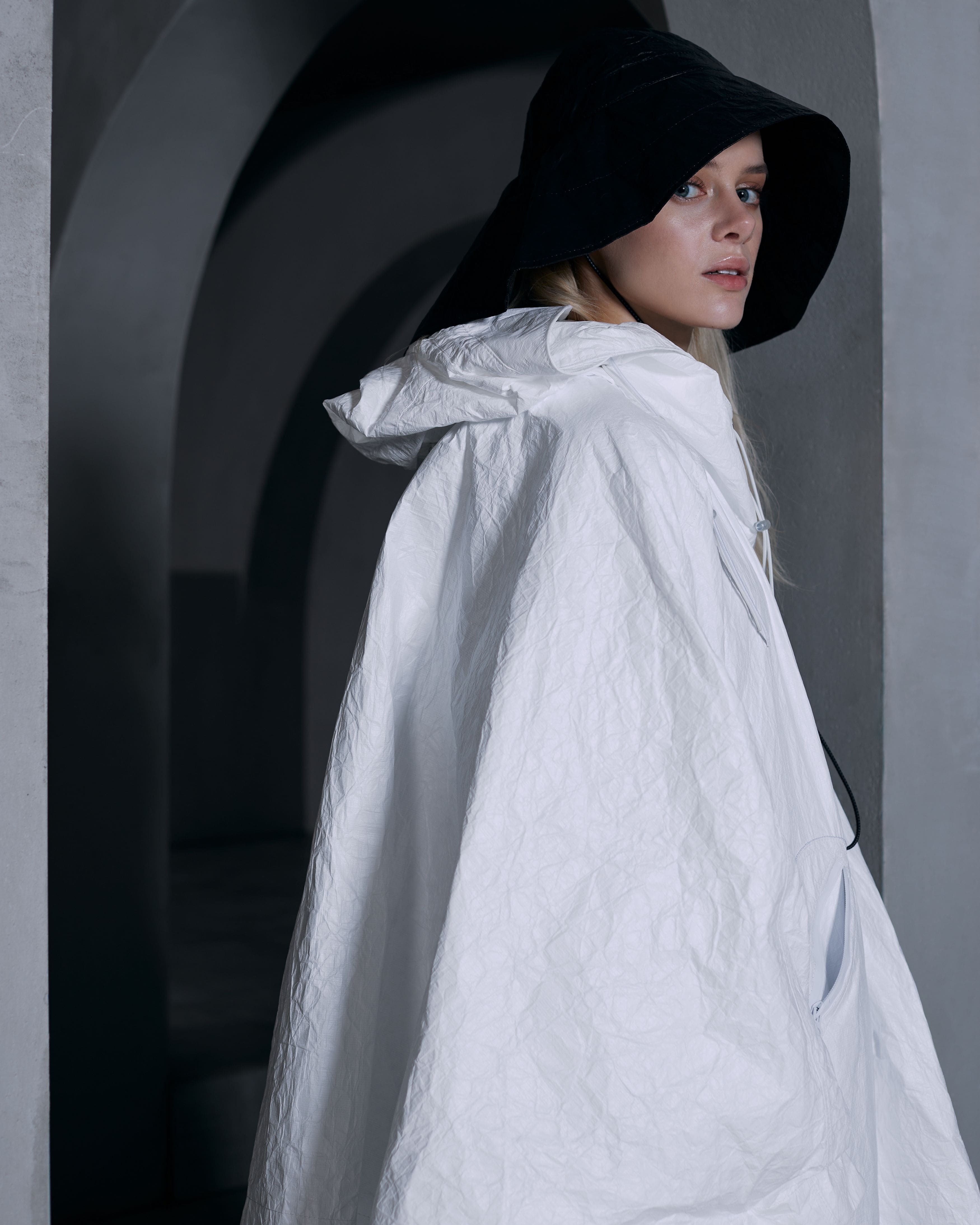 Áo choàng poncho nhẹ từ vải mềm tyvek. Kiểu dáng rộng thoải mái. Mũ trùm với phần lưỡi trai đàn hồi tạo cảm giác thân hình dài hơn. Thiết kế vạt áo theo phong cách không cân xứng. Túi áo to phía ngoài. Khóa kéo chống nước được phủ cao su. Dây buộc trang trí kéo dài. Logo nổi bật màu đen ở phía sau lưng. Nhãn care label phía ngoài được khâu bằng chỉ đỏ.
