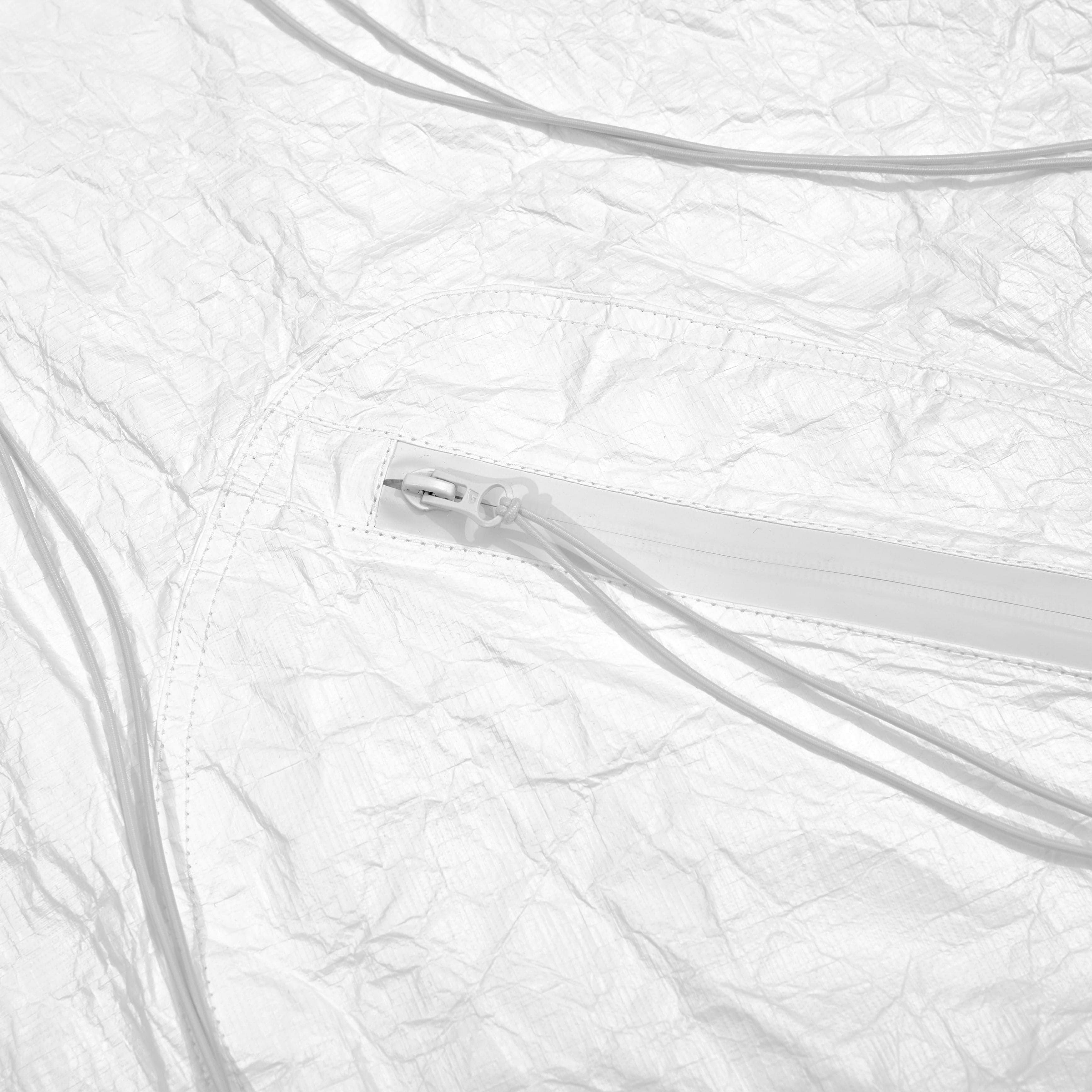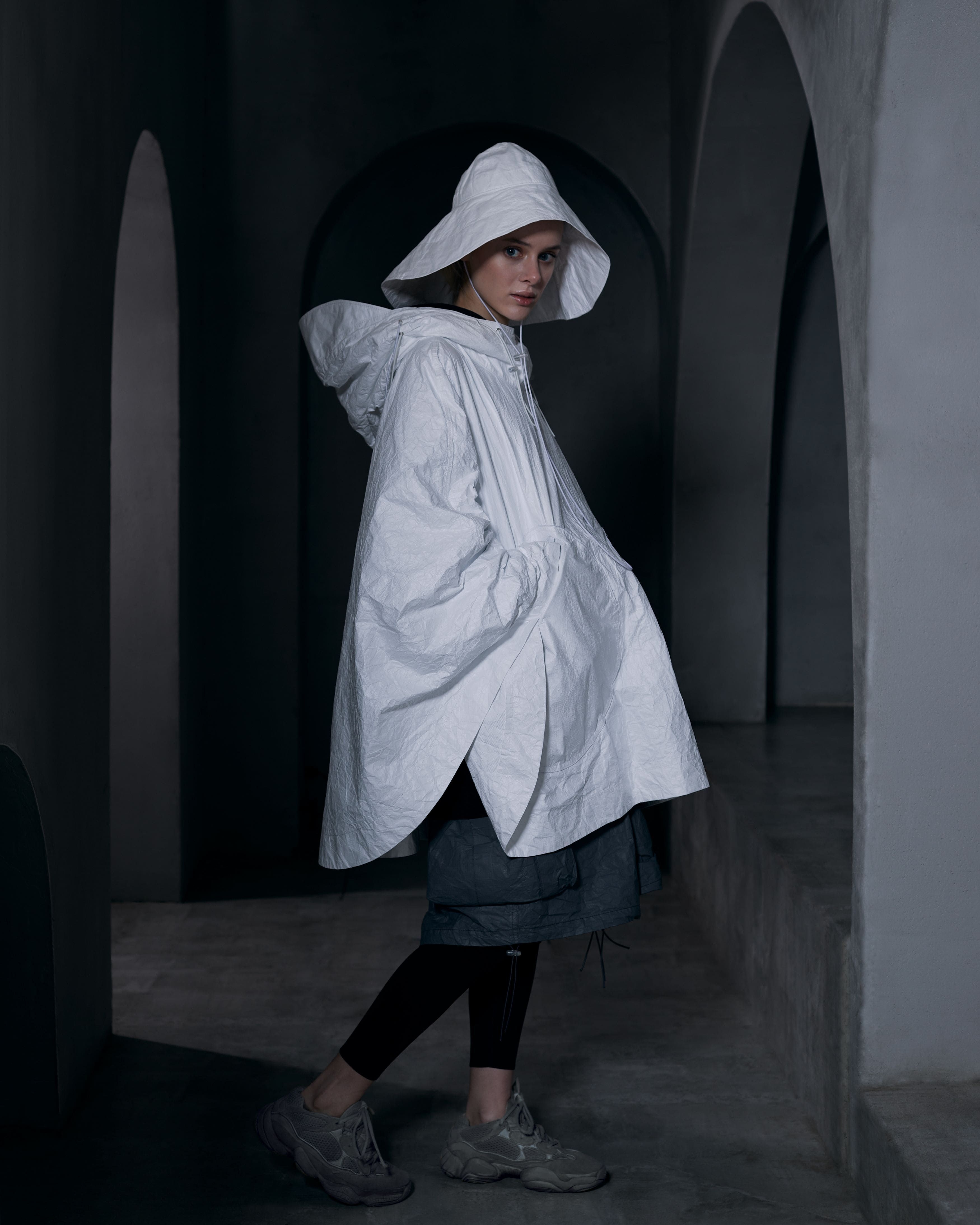 Áo choàng poncho nhẹ từ vải mềm tyvek. Kiểu dáng rộng thoải mái. Mũ trùm với phần lưỡi trai đàn hồi tạo cảm giác thân hình dài hơn. Thiết kế vạt áo theo phong cách không cân xứng. Túi áo to phía ngoài. Khóa kéo chống nước được phủ cao su. Dây buộc trang trí kéo dài. Logo nổi bật màu đen ở phía sau lưng. Nhãn care label phía ngoài được khâu bằng chỉ đỏ.