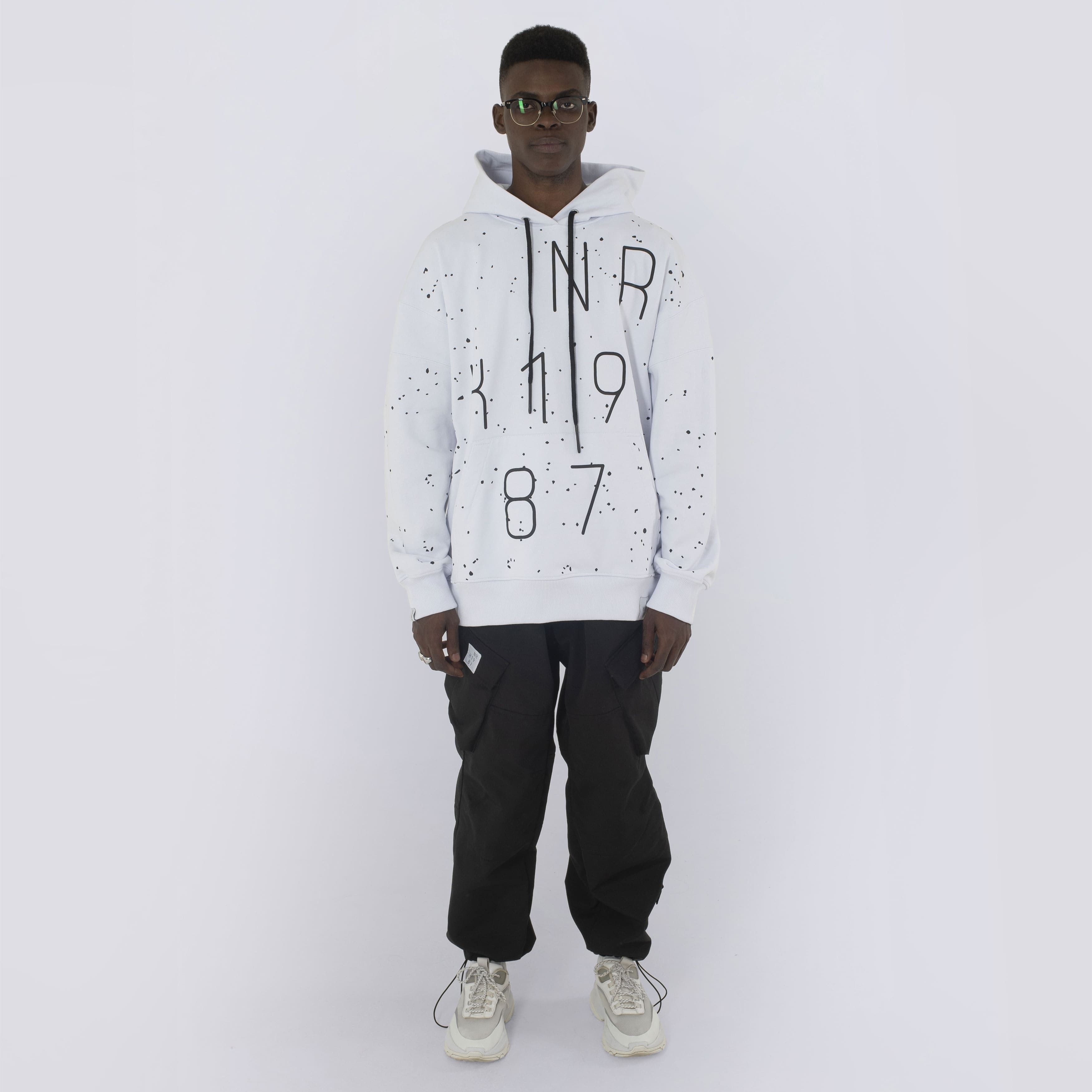 Áo phông trắng chất liệu cotton nhẹ, mịn. Hình logo lớn với các chấm họa tiết. Kiểu dáng suông, rộng với đường may trễ vai. Hình in bền màu có thêm cao su. Chèn vải mặt trái ở vai. Phụ kiện bằng kim loại có đặc điểm nhận dạng thương hiệu. Mũ rộng với lớp lót kép. Dây thắt áo có màu nổi bật. Túi ẩn với thiết bị định vị GPS và chip NFC được khâu dưới logo.