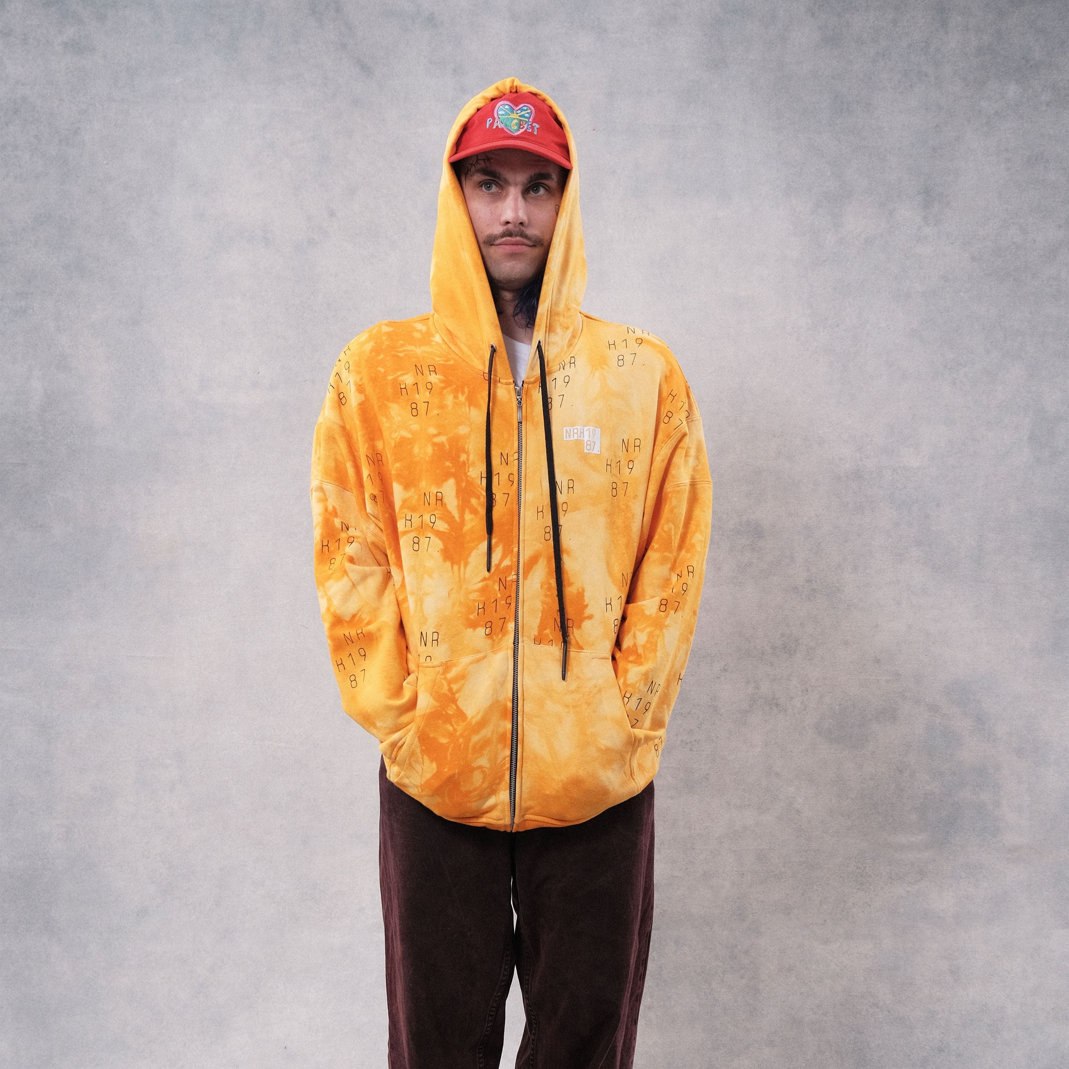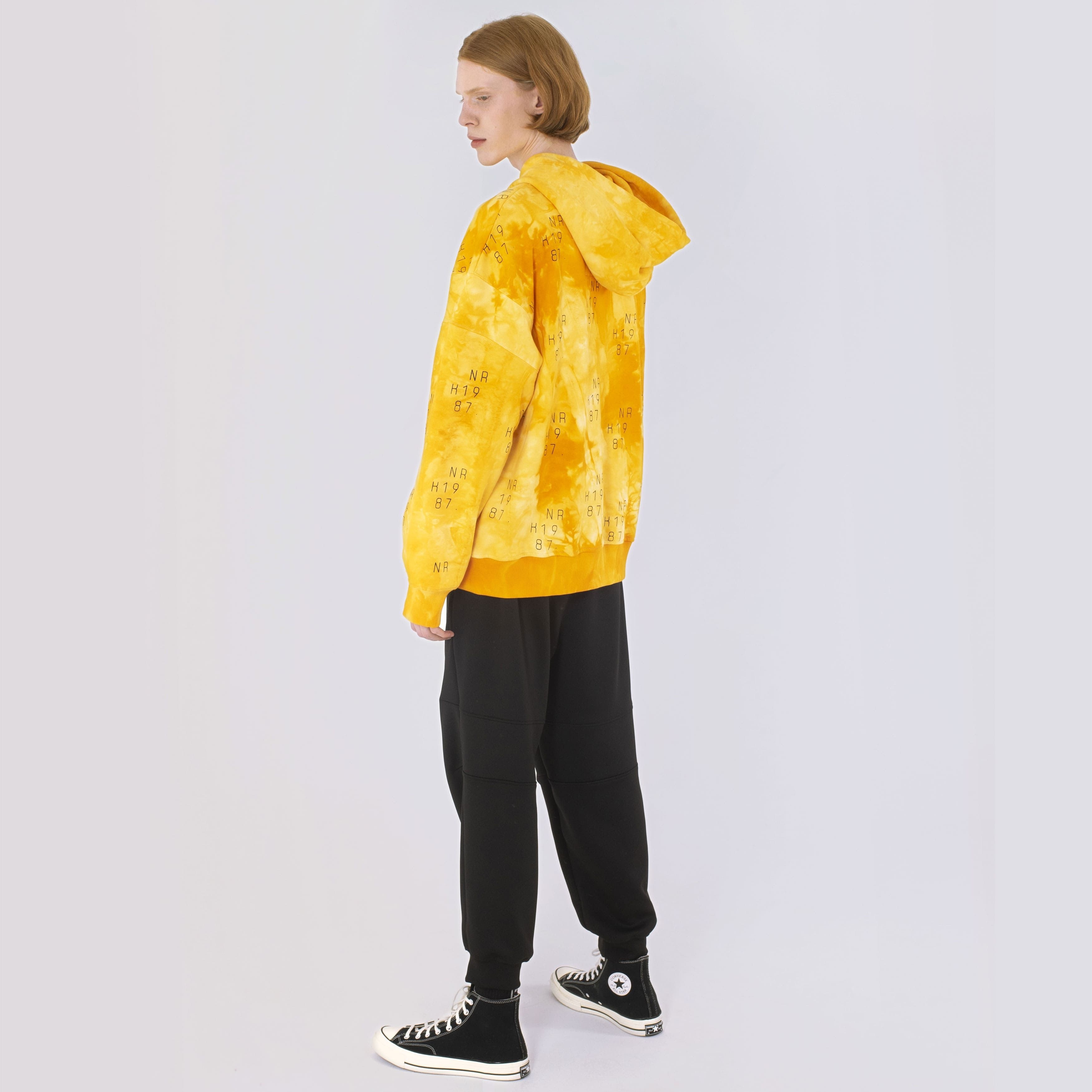 Chiếc áo len có khóa kéo bằng vải nỉ nhẹ được nhuộm màu vàng theo kiểu tie dye, là màu của sao Mộc. Kiểu dáng suông, rộng với đường may trễ vai. Hình in bền màu có thêm cao su. Miếng lót trên vai bằng vải lộn. Phụ kiện bằng kim loại có đặc điểm nhận dạng thương hiệu. Mũ rộng với lớp lót kép. Dây buộc dài phản quang. Túi ẩn với thiết bị định vị GPS và chip NFC được khâu dưới logo.