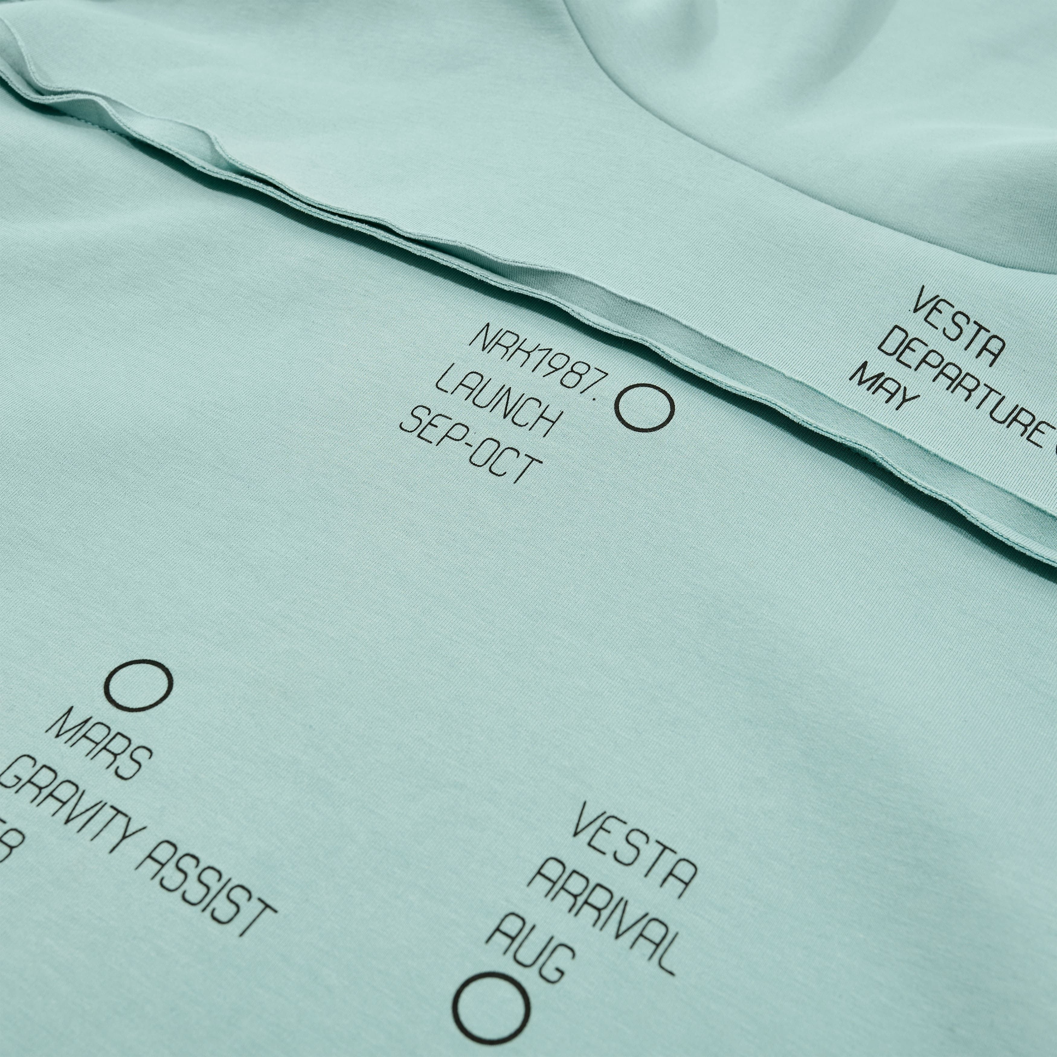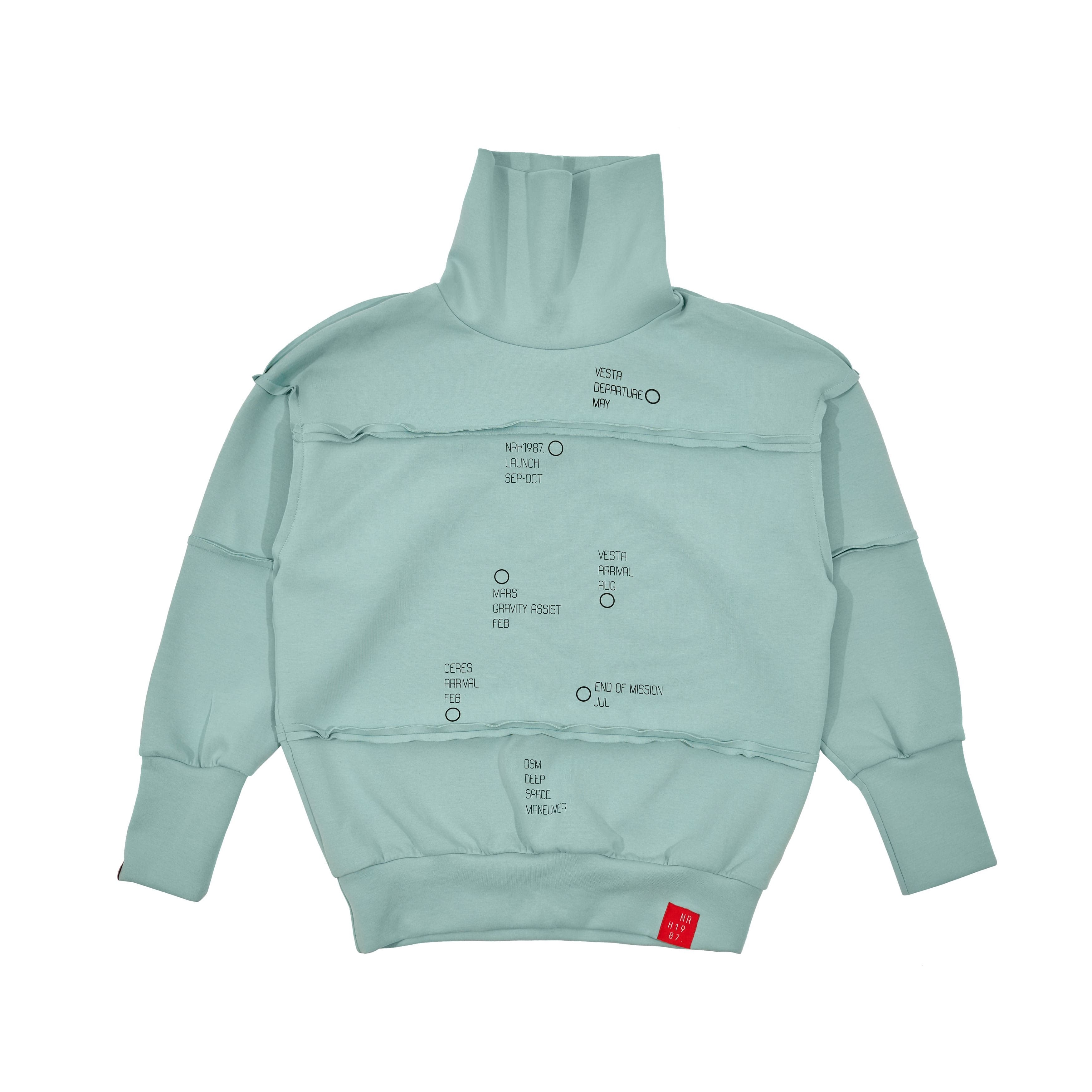 Cổ áo dựng đứng tựa như khẩu trang, giúp che hoàn toàn phần mũi - ý tưởng ra đời trong thời kỳ đại dịch. Hoạ tiết trên ngực - lộ trình tên lửa quỹ đạo đến sao Hỏa với các mốc gia tốc và mốc NRK như điểm phóng. Những ngày trên áo là thời gian thích hợp nhất trong năm để phóng tên lửa hiệu quả và tiết kiệm nhất. Trên nhãn ở cổ áo - dữ liệu cơ bản về sao Hỏa, mục tiêu, triết lý và sứ mệnh của thương hiệu.